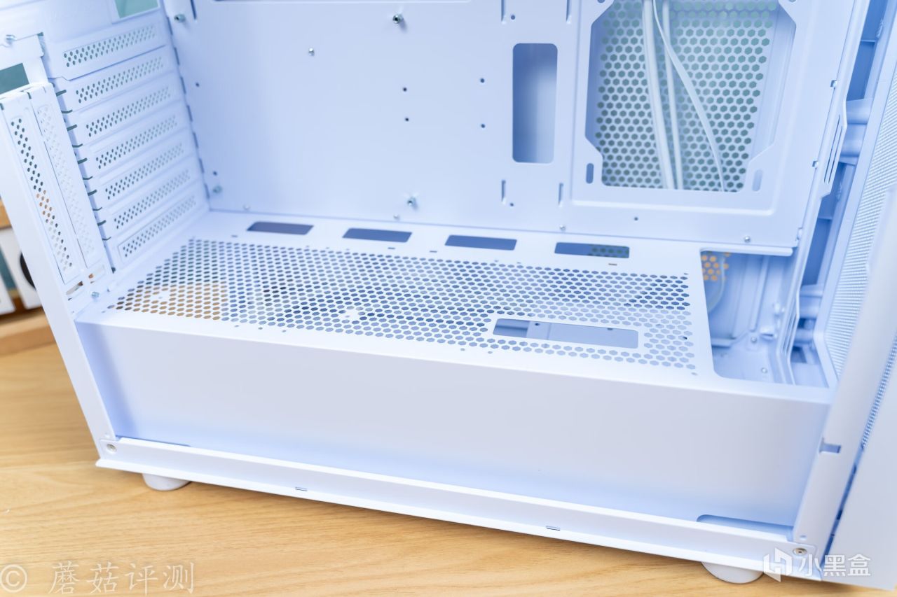 ▼底部电源仓的顶盖部分,支持安装固定三把机箱风扇,专门照顾显卡部分的散热。电源仓顶部的开孔,方便气流通过。