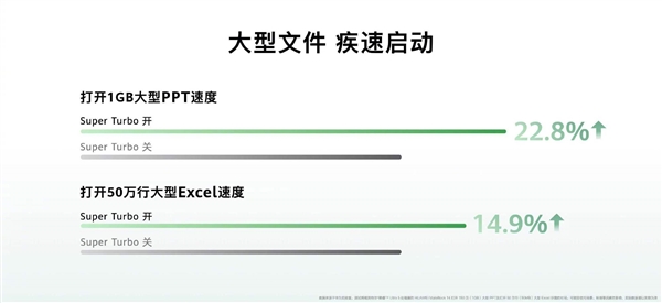 在开启SuperTurbo模式后,能够显著提升办公软件的打开速度,如PowerPoint文件速度提升22.8%,Excel文件速度提升14.9%。