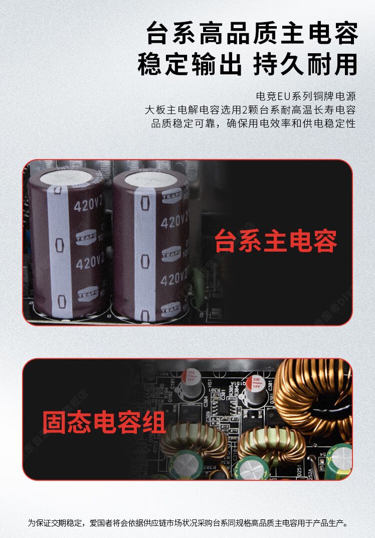 由于是新手向的教程,所以我们就不做拆机讲解,这玩意太复杂了,可能会导致新人难以理解,最简单的方式就是,买之前看看宝贝详情或者问客服,看看这个电源的电容是什么产地的。在耐用性和优劣性上 日系>台系>国产 所以尽量选择使用日系和台系电容的电源。还是以我买的EU850这个电源为例,能看到宝贝详情有标注用的是台系电容。