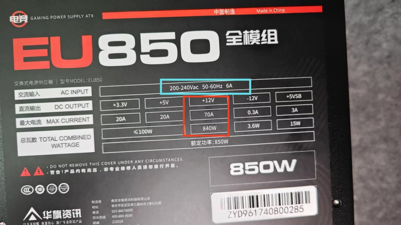 - 蓝色框标识的是输入的电压,譬如EU850这个电源,能够输入200-240V的电压,譬如咱们国内的电压一般是220V,这个电源在咱们国内使用是完全没问题的。