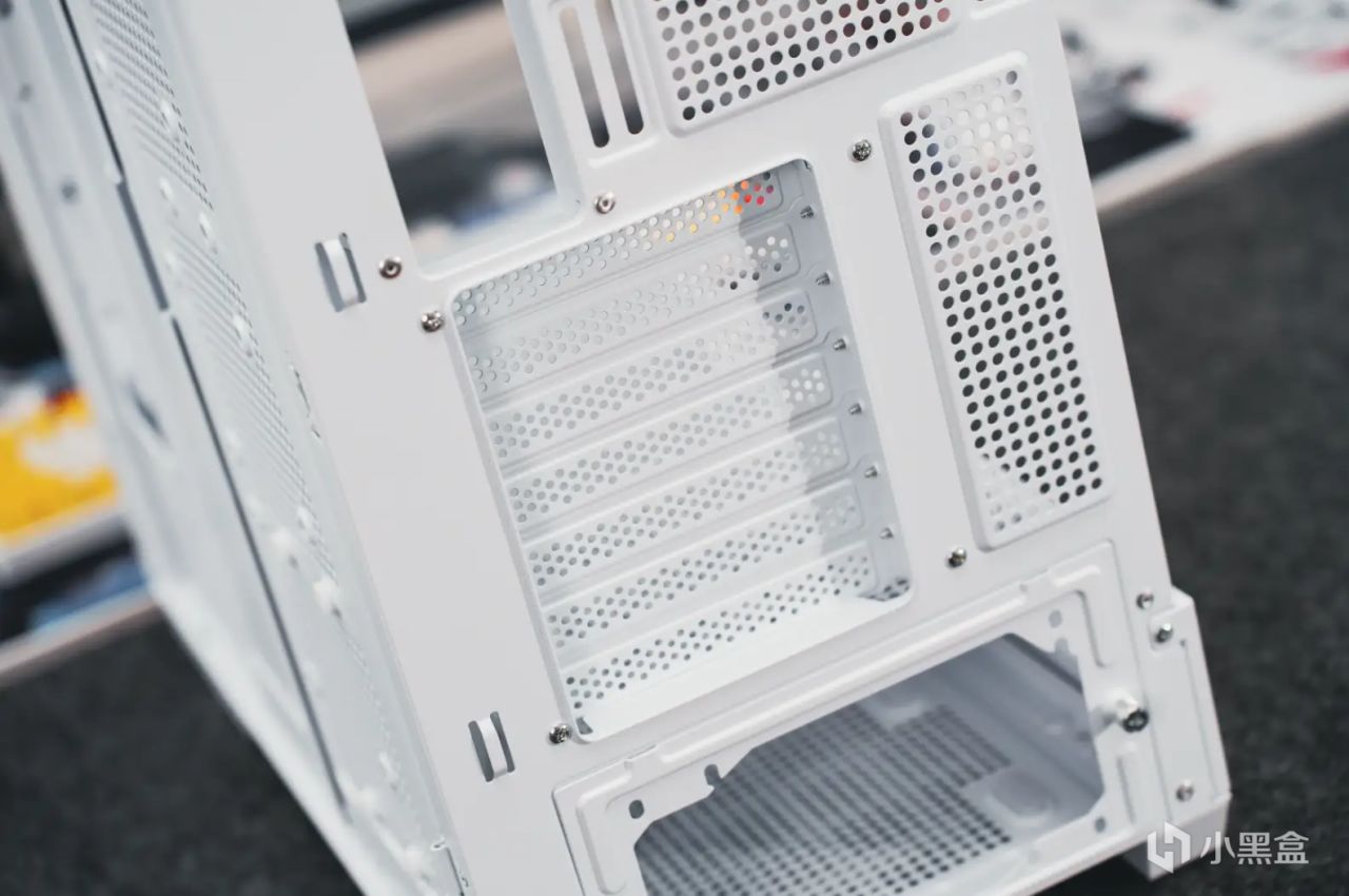 當然,還有PCIe插槽區域,愛國者星璨·大嵐機箱標配可拆卸的顯卡擋片模塊,通過PCIe延長線,可支持顯卡豎裝。