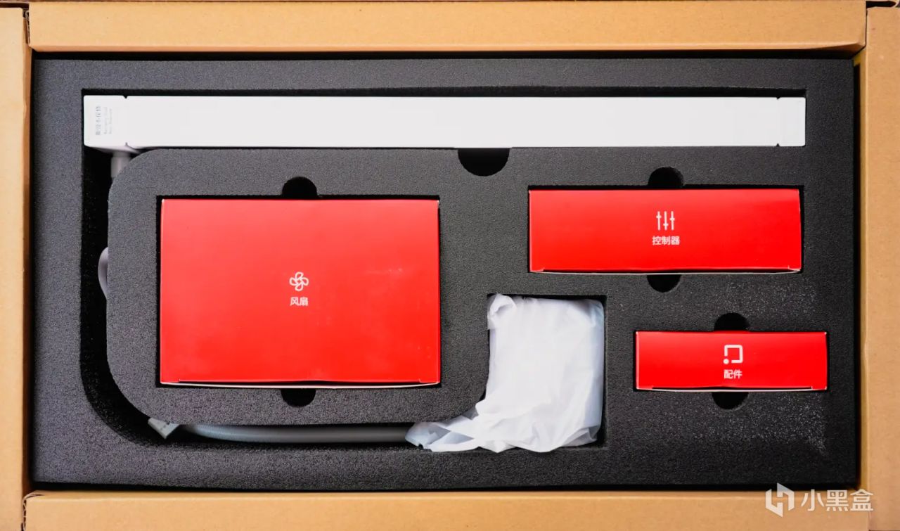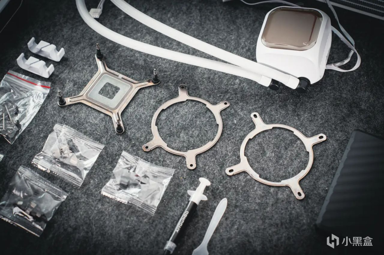 同時該包裝也是非常華麗,開箱的過程中感覺是在打開一個禮盒,水冷散熱器的所有組件都被放置在包裝盒中,並還用中文進行標明。