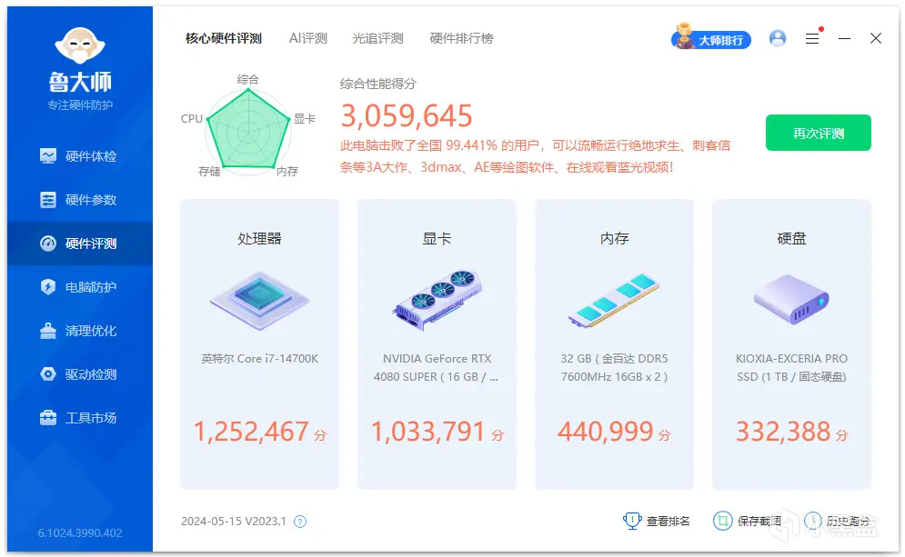 整機綜合性能得分是3059645分,其中處理器得分是1252467,顯卡得分是1033791,內存得分是440999,硬盤得分是332388。