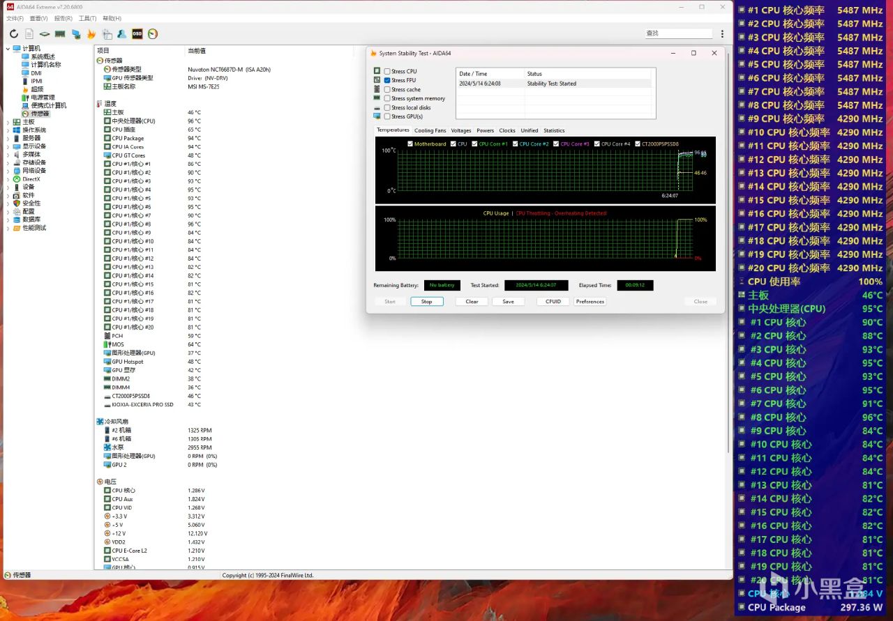 拷機實測,在室溫24℃的情況下,通過AIDA64單烤FPU,i7-14700K核心電壓1.284V,功率300W左右,實測10多分鐘拷機穩定爲95℃,表現中規中矩。