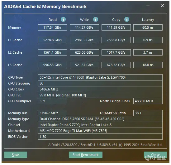 內存直接使用金百達 白刃RGB內存的默認XMP,默認性能就非常強悍了,都不需要進一步超頻。實測內存讀取速度爲117.54GB/s,寫入爲114.27GB/s,複製爲111.39GB/s,延遲爲60.5ns。