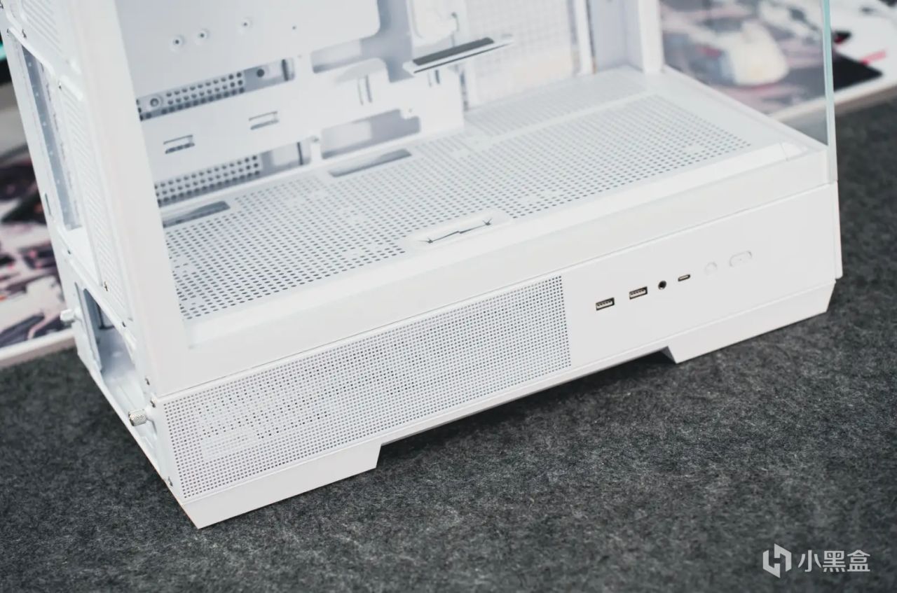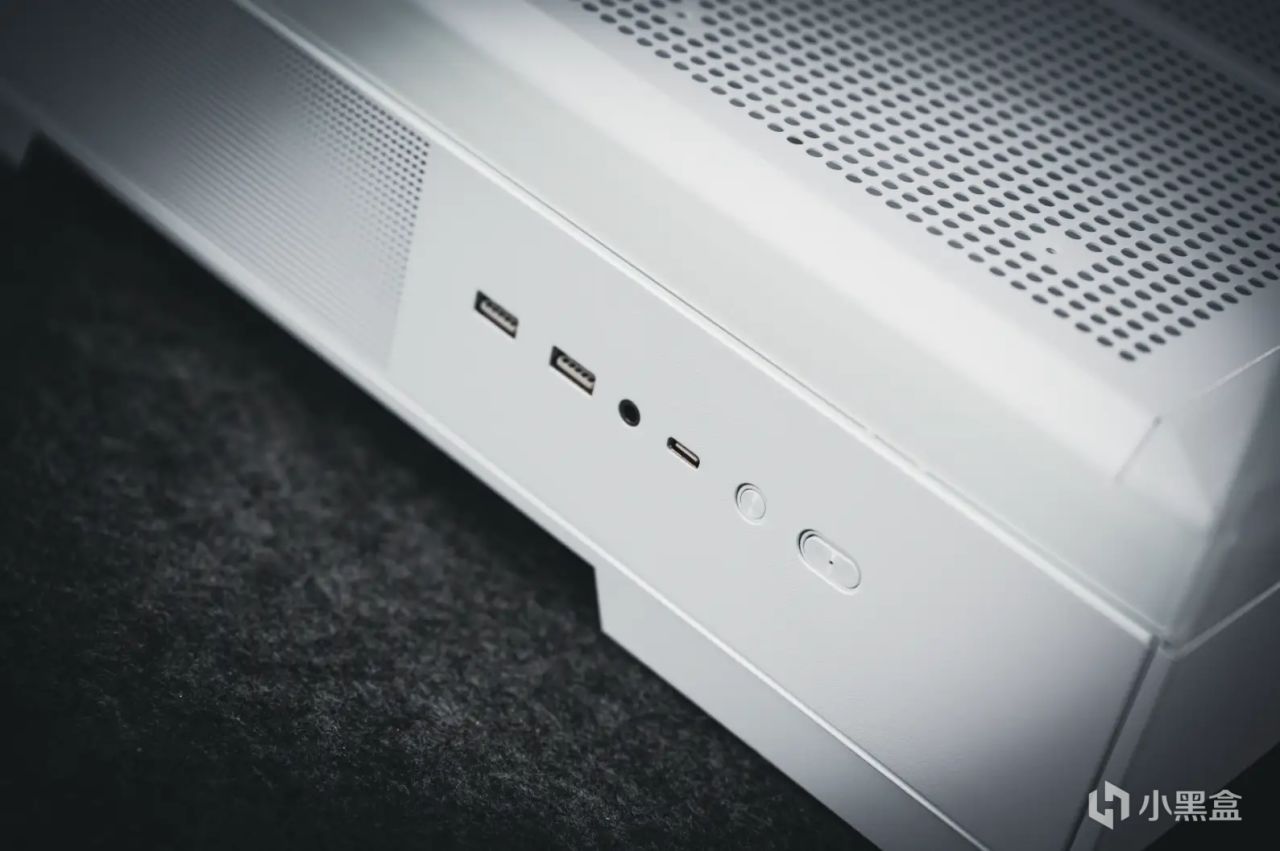 機箱的I/O接口被放置在底部,這也表示該機箱最好的放置在桌面上使用。從左到右的開關分別是2個USB 3.0、一個3.5mm音頻接口、一個Type-C、一個重啓以及一個電源鍵。