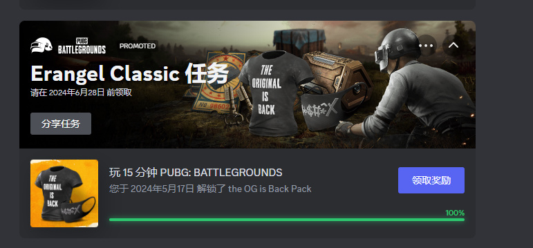 discord是國外熱門的聊天社羣軟件,現在開啓PUBG掉寶活動,獎勵內容爲一個口罩,體恤,一個管理員寶箱,二十張黑貨票卷。