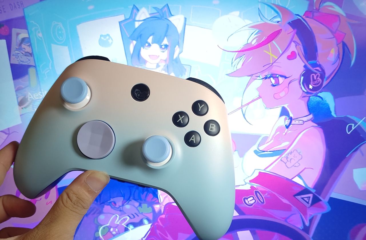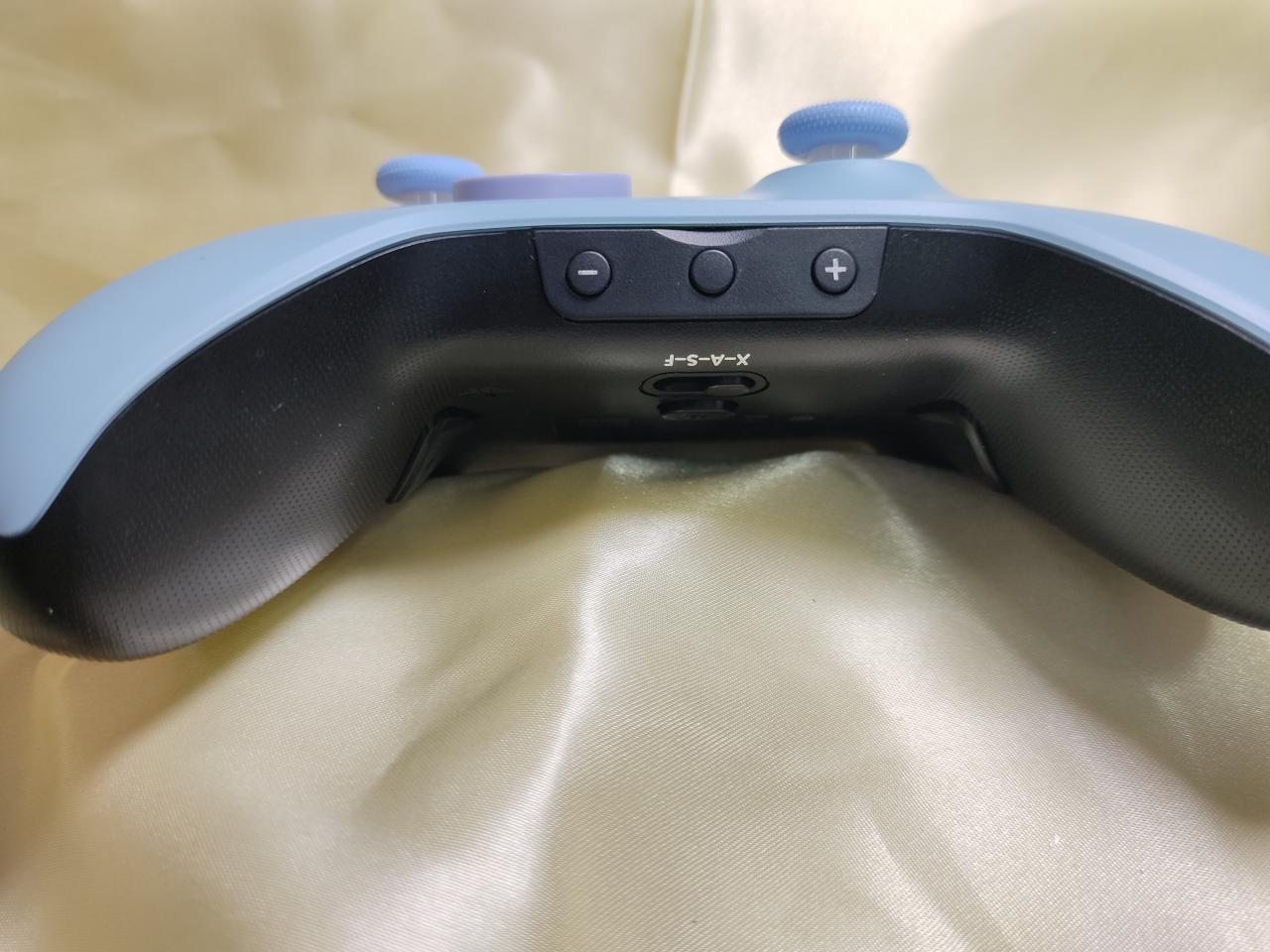 正面爲非對稱佈局,ABXY區域爲傳統的Xbox佈局,支持鍵值互換。十字鍵給了兩個,一個爲帶有磨砂質感的十字鍵,另一個爲八向十字鍵(上圖中有不同十字鍵的照片)這邊是建議: