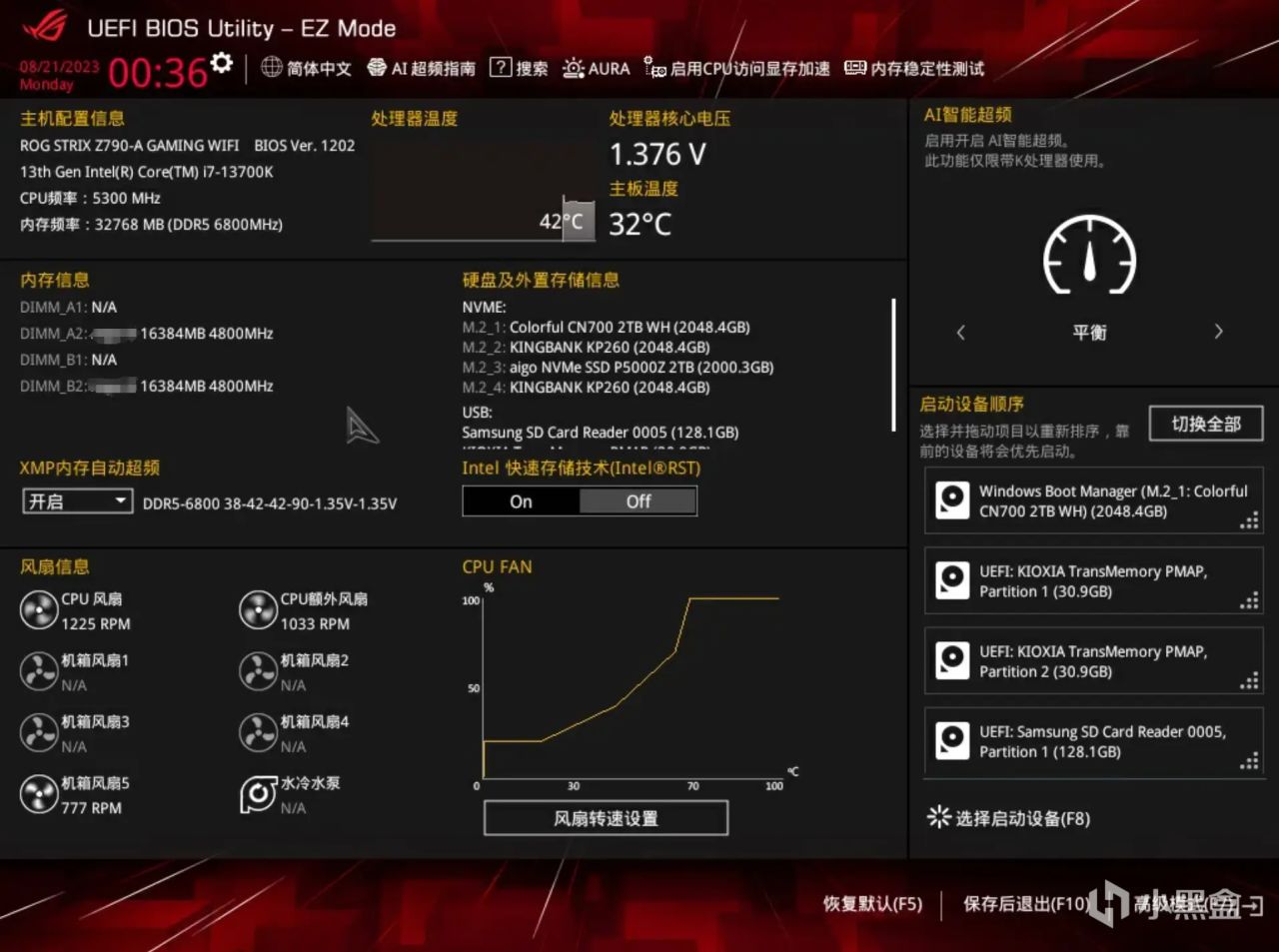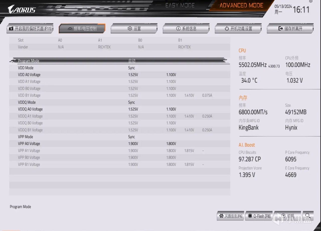 比如我使用的技嘉主板,在BIOS首頁左下角,就提供了XMP設置選項,只需要點開選項,選擇星刃DDR5內存預設的XMP1設置即可。這裏也可以看到金百達星刃48GB 6800MHz套條預設一組XMP、一組EXPO頻率,跟CPU-Z讀取到的信息一致。