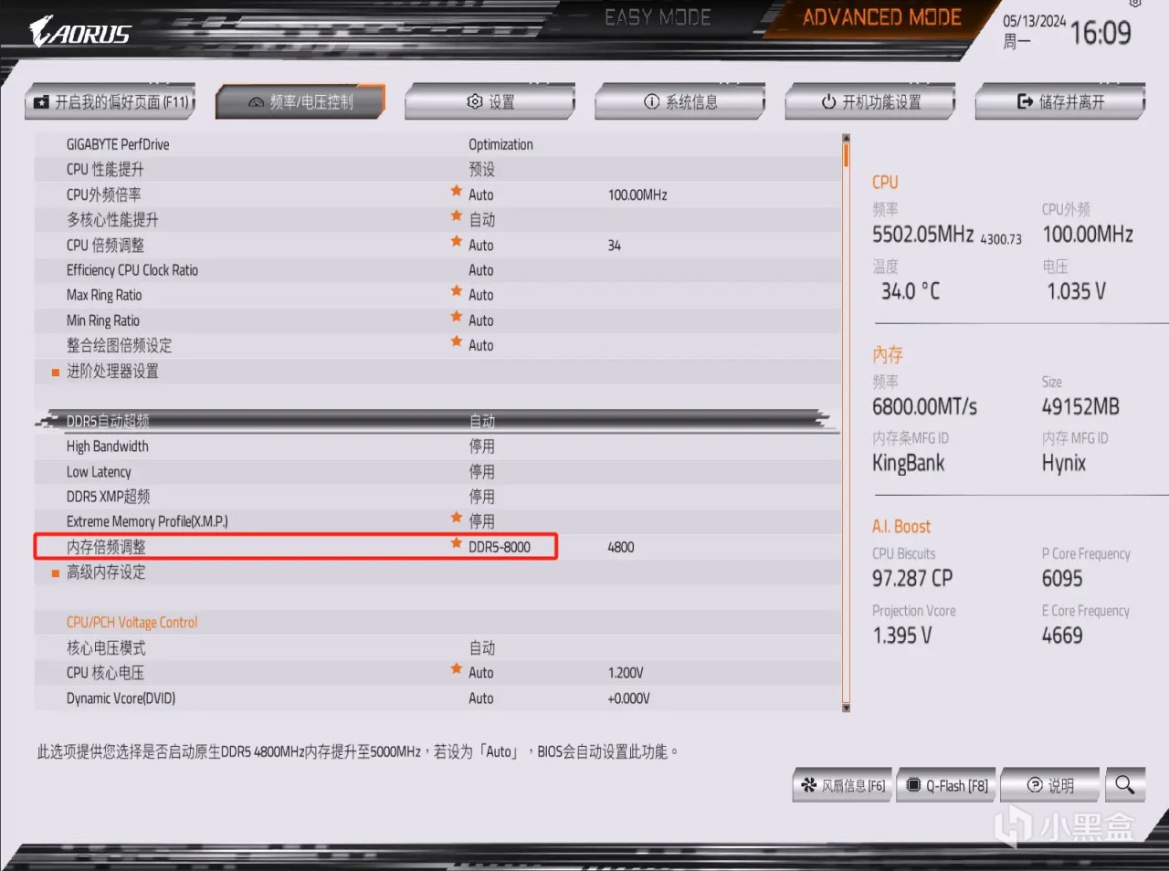 需要強調的是,手動超頻需要看主板內存頻率支持和CPU體質,如果追求DDR5內存超頻一般建議使用最新的Z790主板搭配i5-13600K及以上級別CPU,我目前使用測試平臺選用的就是技嘉Z790冰雕X主板,內存頻率可以支持到8266+,在DDR5內存頻率支持這塊,技嘉目前在板廠中還是很有優勢的。