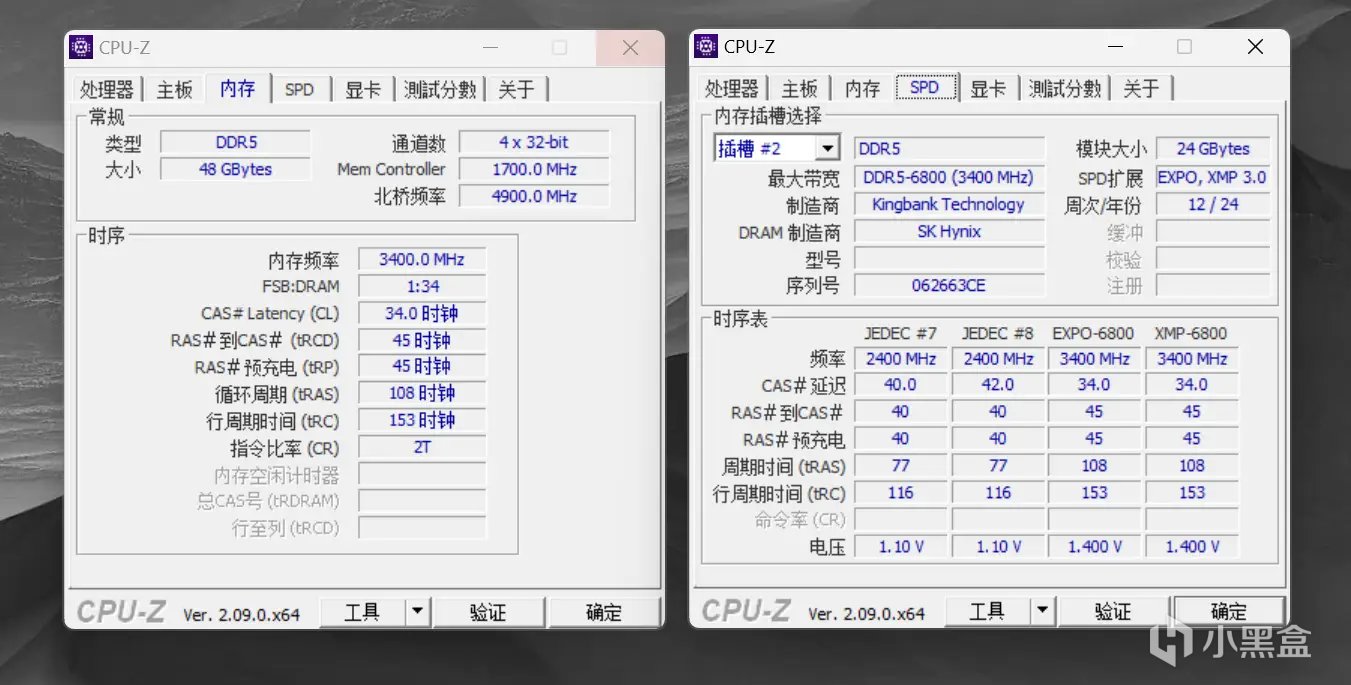 使用CPU-Z查看內存SPD信息:內存製造商Kingbank,DRAM製造商SK海力士,24年第12周生產,內存原始頻率4800,預設一組XMP頻率,一組EXPO頻率,均爲6800MHz時序CL34-45-45-108,預設電壓爲1.4V,基本信息跟我之前測試的金百達刃系列24GBx2 6800套條基本一致。