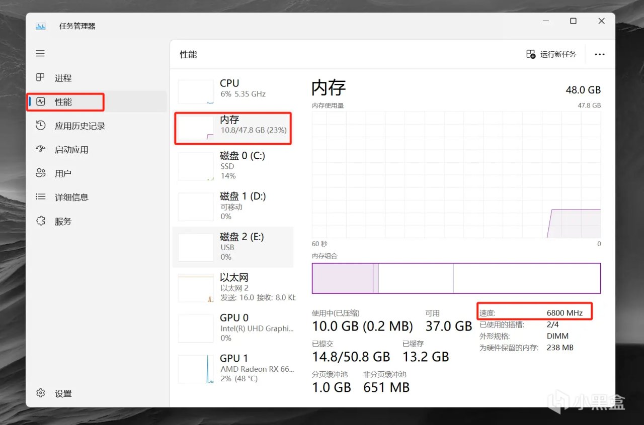 電腦【開始菜單】鍵上右鍵,選擇【任務管理器】,然後依次選擇【性能】【內存】,就可以看到內存已經運行在6800MHz速度了,據說Windows也要統一內存速度單位爲MT/s了,未來這裏應該會顯示6800MT/s。