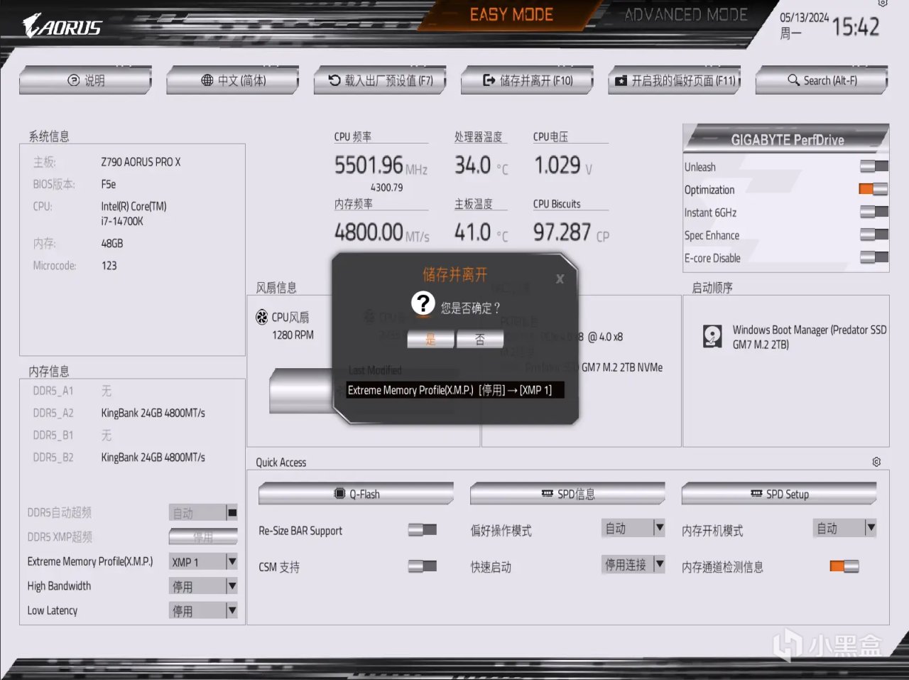 開啓XMP1後按F10保存退出即可,這裏會有BIOS設置變更確認。