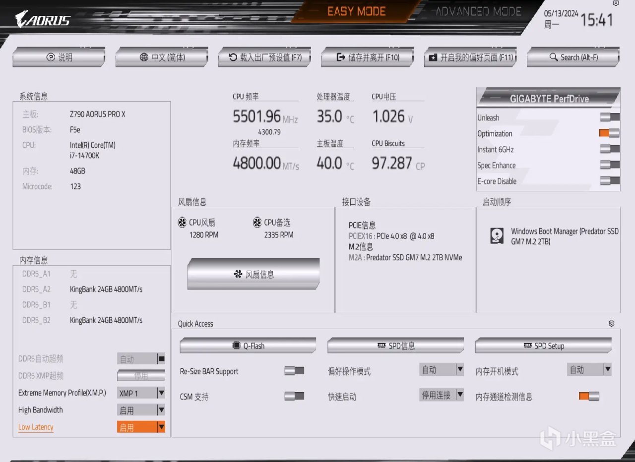 同樣是在BIOS中進行設置啓用,首頁左下角XMP設置下的【High Bandwidth】和【Low Latnecy】兩項選擇開啓,然後F10保存重啓進入系統。