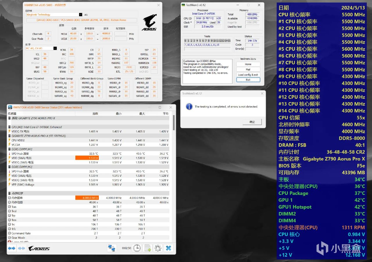 使用TM5配合針對DDR5內存優化後的1us配置文件進行壓力測試,多次3輪測試不報錯,算是穩定超頻到了8000MHz頻率。