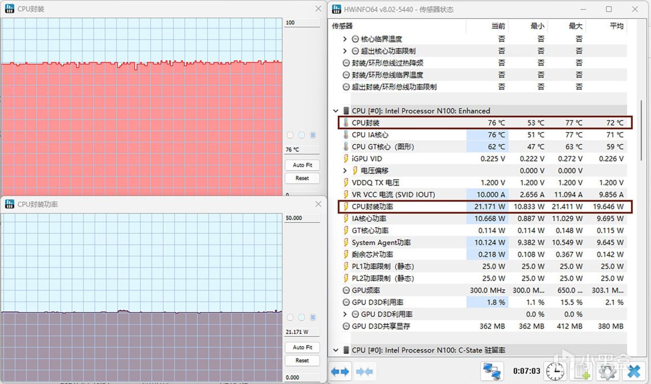 最后说说散热与温度部分,英特尔N100处理器自身功耗不算高,在室温28℃的环境下进行烤机测试,使用AIDA64软件FPU项目进行长时间压力测试,处理器满载时平均功耗仅为21W,即使双烤功耗也是21W,此时核心最高温度为77℃,在满载时运行噪音很低,而且没有任何异常啸叫声,在一般负载状态下功耗约为10W,核心温度会维持在45℃左右。