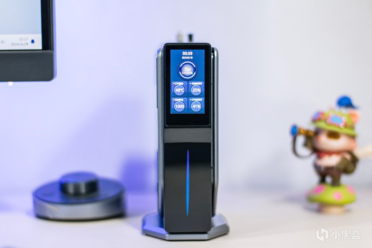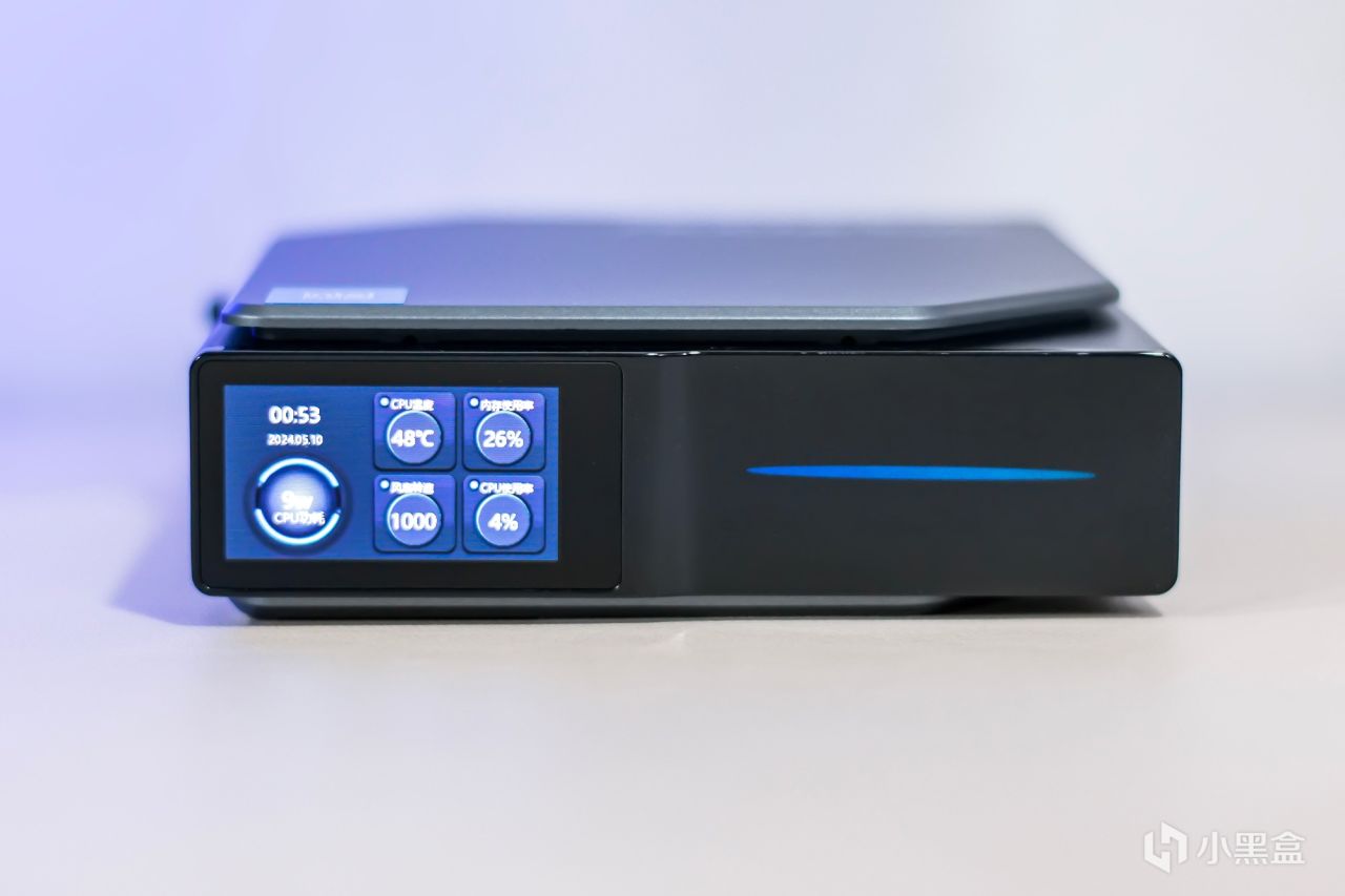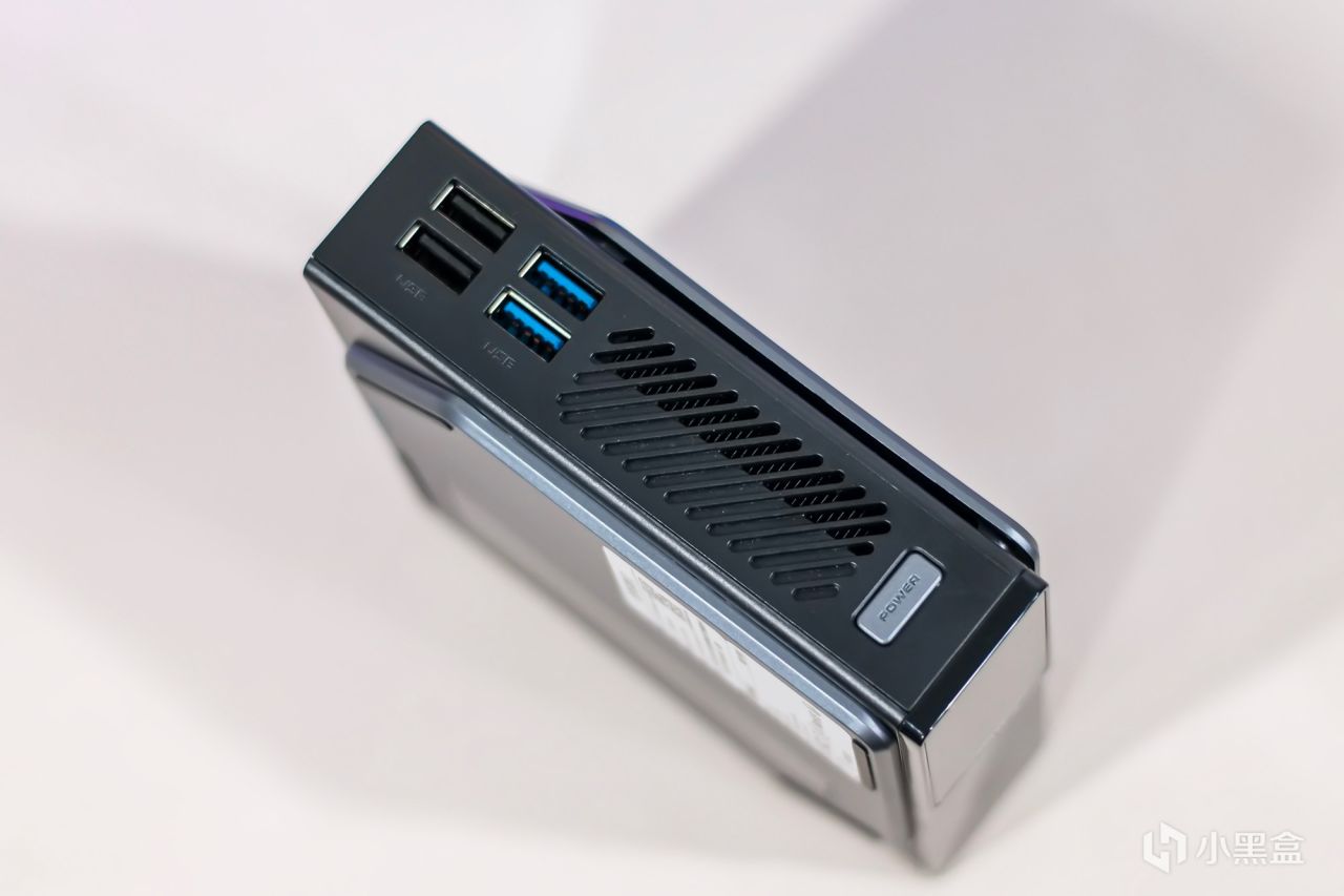 位于迷你主机的前部采用黑色烤漆光亮表面设计,还设计了一块小尺寸的显示屏幕与细长的RGB指示灯,当系统启动后RGB指示灯会亮起,具体灯效可在控制软件中设定,显示屏幕能够显示当前硬件状态信息,比如处理器功耗温度,内存使用率以及风扇转速等信息,不过需要搭配专属软件才能实现,默认情况下也能显示当前时间。