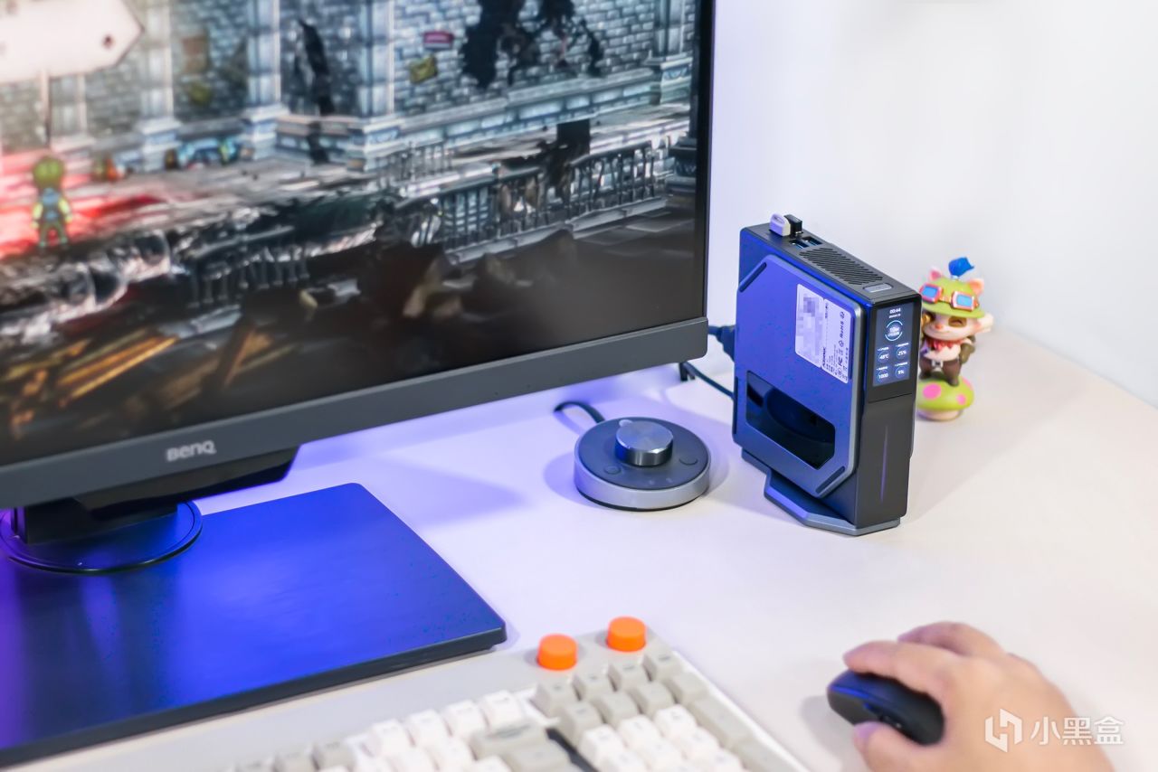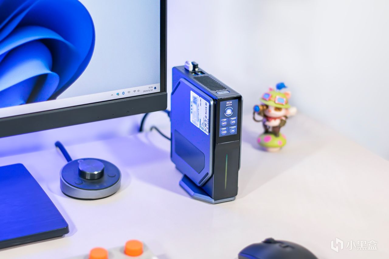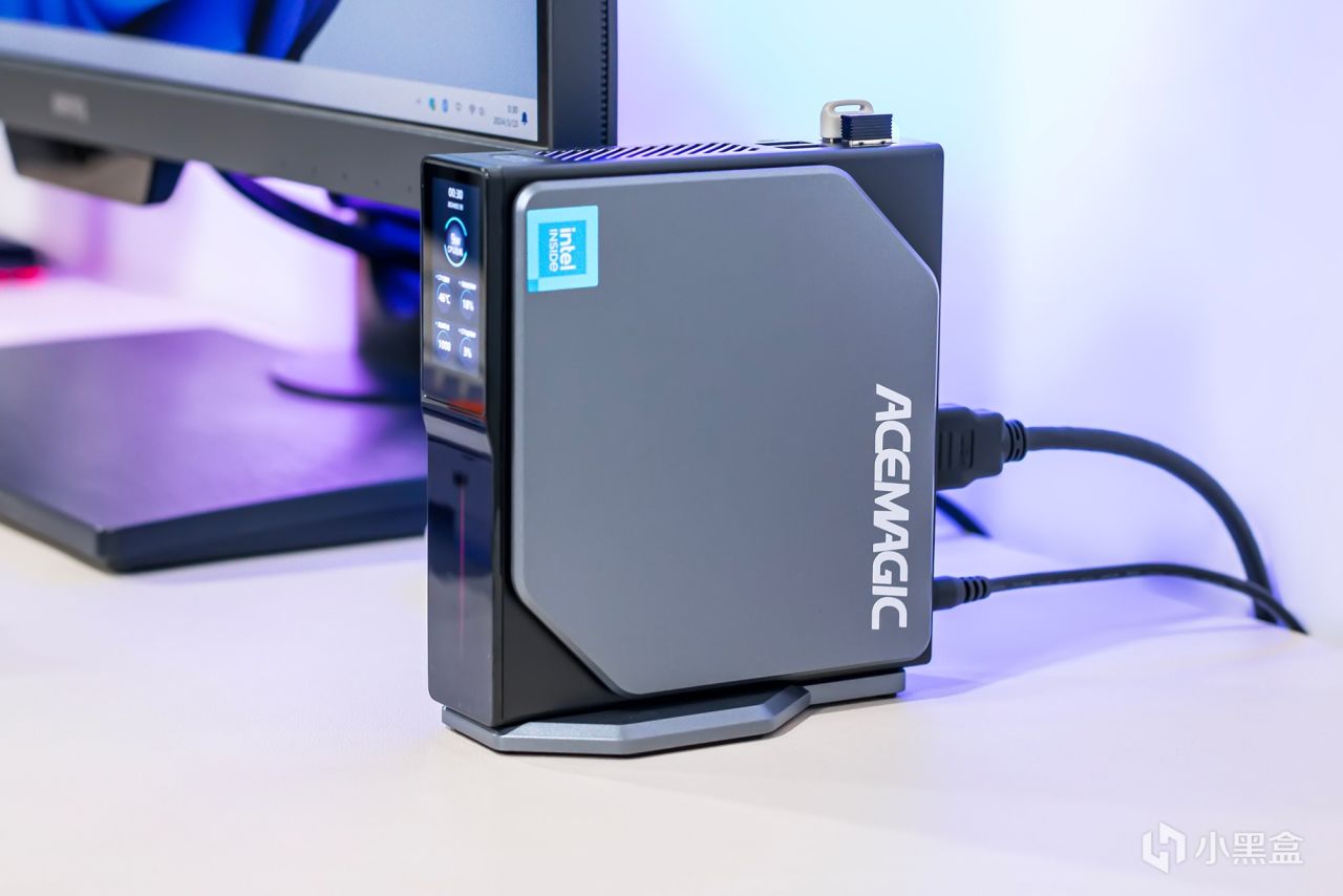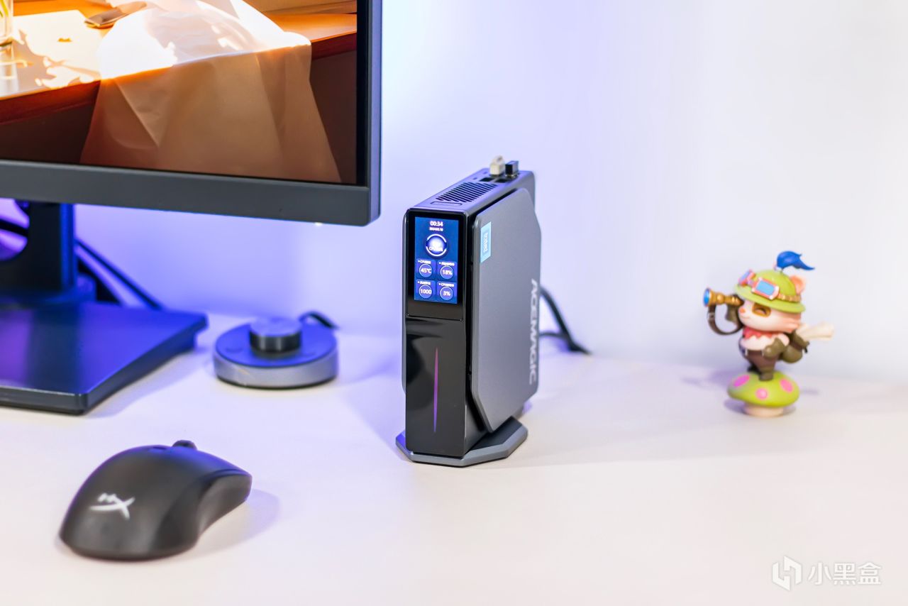 阿迈奇S1迷你主机对于摆放位置方向并没什么要求,其支持横放与竖放两种放置方式,不管如何摆放也并不会过于占据空间,竖放的话需要搭配附带的底座,与主机采用磁吸式固定方式,尺寸更宽让摆放更为稳固可靠,有效防止因振动突然倾倒,横放的话可放置于显示器下方,个人更倾向竖立摆放,只需一点点桌面空间就够放置,而且在插拔移动硬盘等设备更容易。