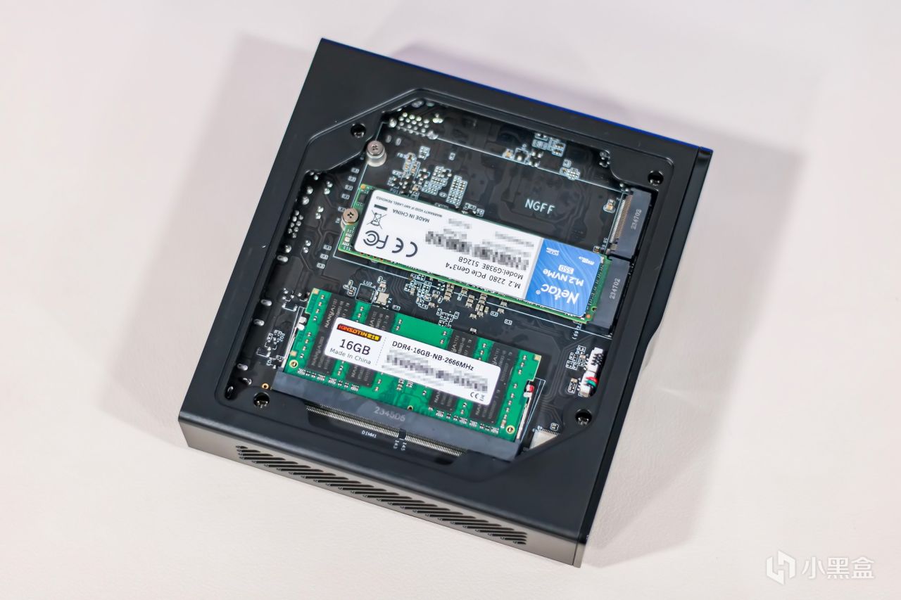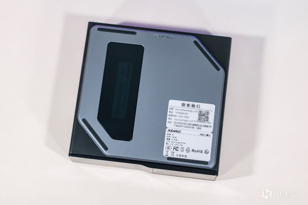 迷你主机左侧(横放的底面)盖子设计了四条细长的防滑橡胶垫,侧边粘贴了印有主机参数规格信息,认证标准与厂商信息的贴纸,厂商为迷你电脑提供了180日只换不修与2年超长质保服务,盖板其采用磁吸式固定,只需轻轻一提即可卸下,可见内部的内存条与固态硬盘,如有需要可自行更换或升级内部硬件。