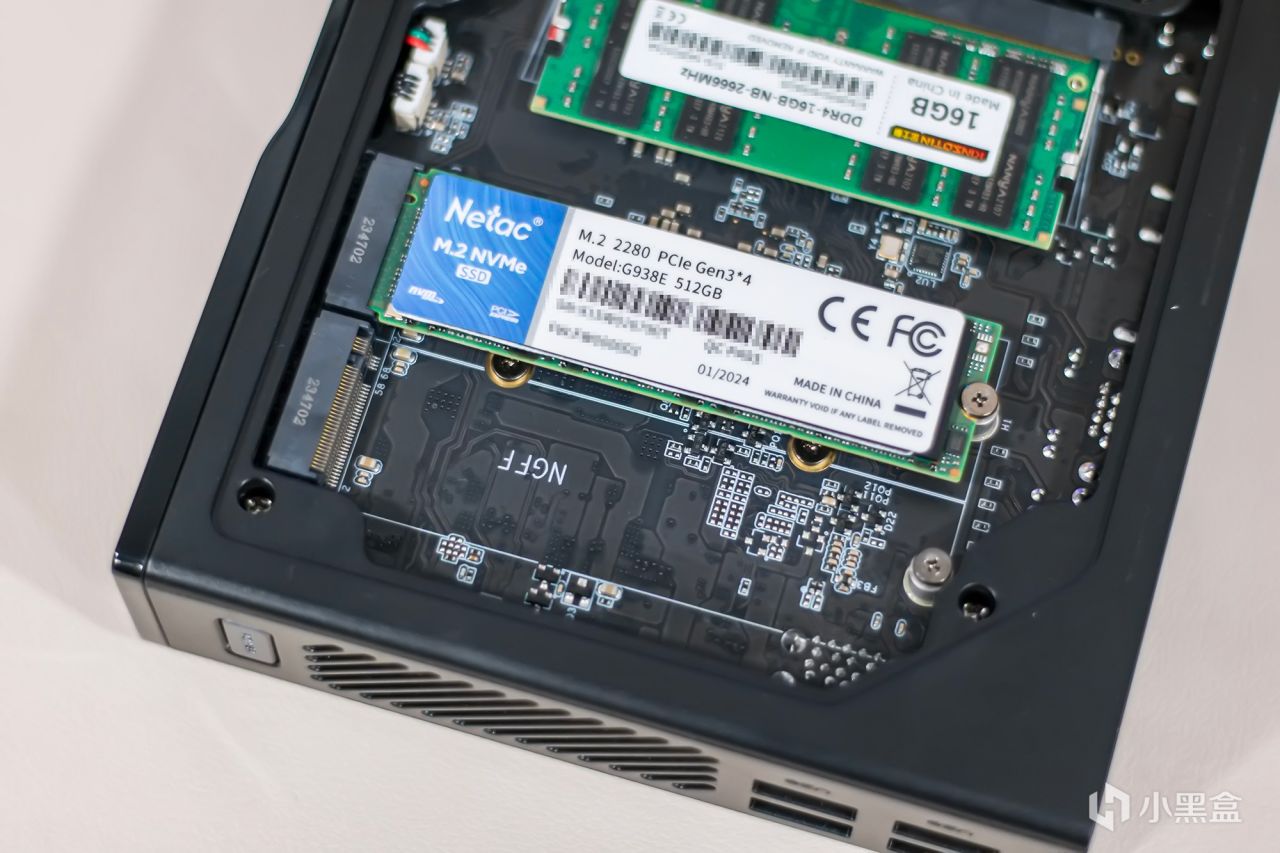 迷你主机搭载了来自朗科的M.2固态硬盘,其采用M.2 2280尺寸规格,容量为512GB,支持PCIe3.0×4传输协议,经查询固态硬盘的读度可达3500MB/s,下方还提供一个M.2固态硬盘插槽,能够加装NGFF接口仅支持SATA协议的M.2固态硬盘。