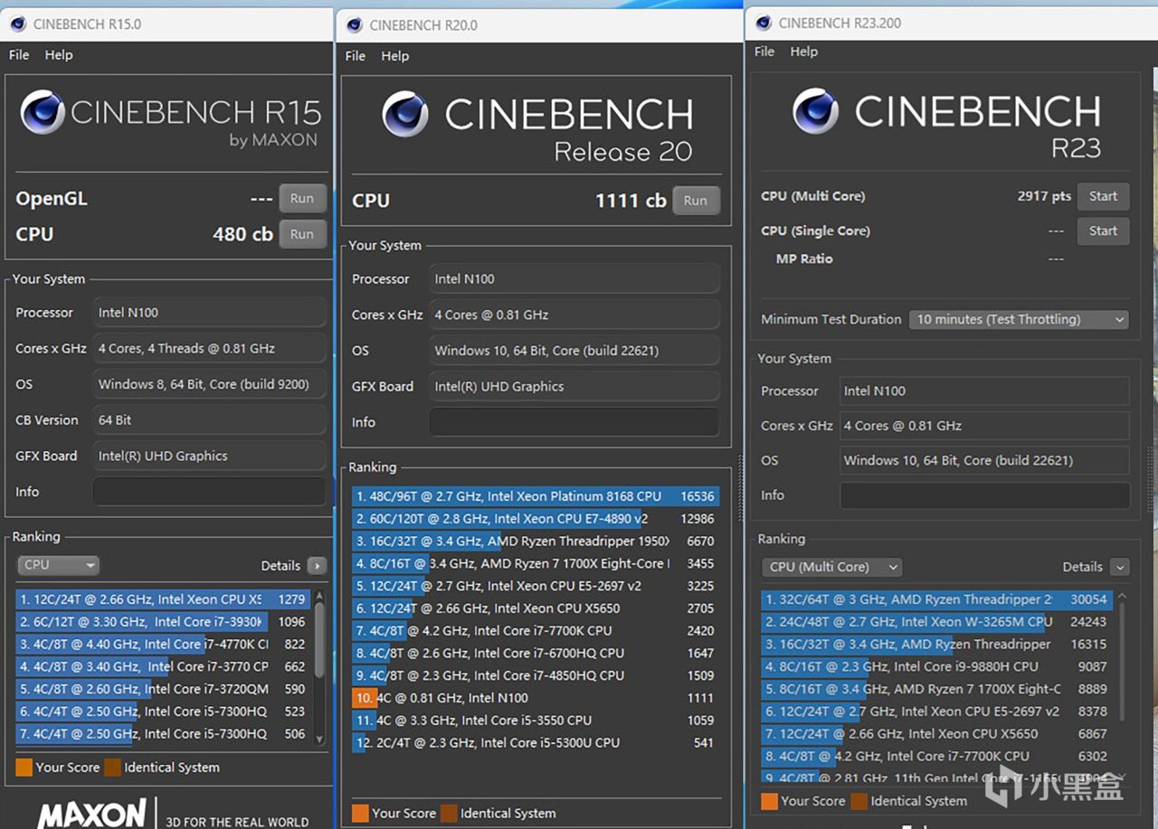 先对CPU进行基准性能测试,利用CineBench系列渲染测试软件,英特尔N100处理器在R15软件中的多核跑分为480分,R20软件多核跑分为1111分,至于R23软件的多核跑分为2917分。