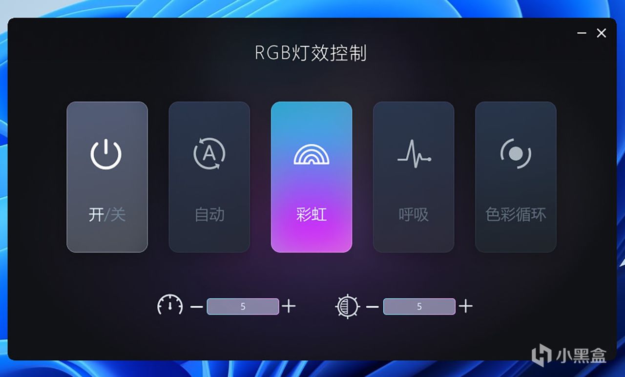 在RGB灯效控制软件中易用度很不错,不过可自定义程度并不高,用户可选择开启或关闭灯光效果,软件提供了三种灯效模式可以选择,分别是彩虹、呼吸与色彩循环,或者开启自动模式会循环展示效果,还能够设定灯效的亮度与流转速度,不过没法对灯光色彩进行细微调节,或者自定义单色常亮等效果。