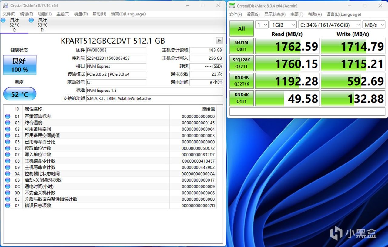 硬盘方面,其搭载的是PCIe3.0×4固态硬盘,不过仅运行在PCIe3.0×2模式下,主要是处理器说提供的PCIe数量相当有限,实测顺序读写速度分别为1760MB/s与1714MB/s,单线程4K读写性能速度分别为49MB/s与132MB/s。