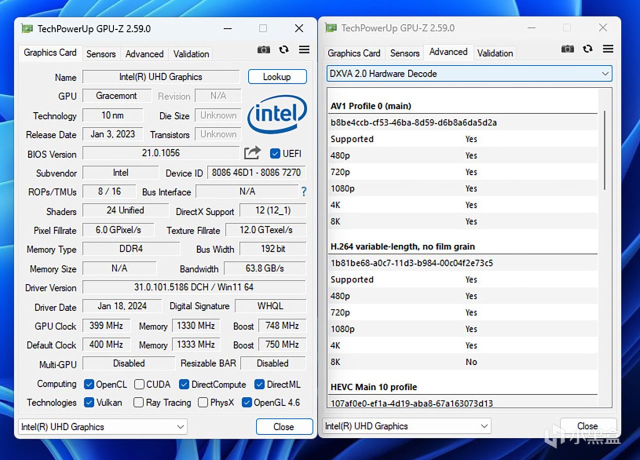 英特尔N100处理器集成Intel UHD Graphics核心显卡,其内置24个执行单元,核显的最大动态频率为750 MHz,根据GPU-Z检测软件所示,光栅单元与纹理单元分别为8个与16个,支持DirectX 12与Intel Quick Sync Video 技术。