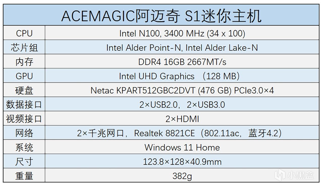 本次就不对其进行拆解,磁吸式固定防尘盖板轻易升级更换硬件,另一方面,低功耗处理器对于散热系统要求不高,它的价位已经大致决定了性能水平,先来说说硬件配置方面,阿迈奇S1迷你主机搭载了英特尔12代N100处理器,搭配16GB内存与512GB固态硬盘,为了让更直观地了解迷你主机的性能表现,接下来对其进行各项性能测试。