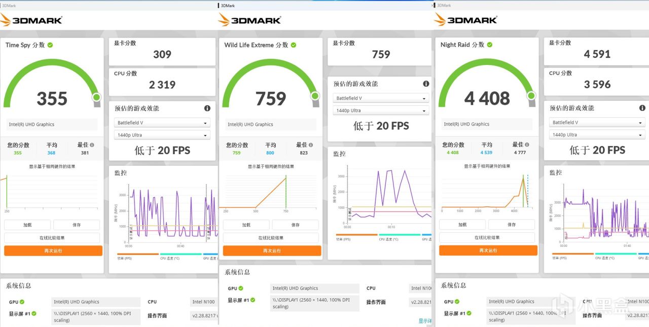 对核显进行性能跑分,在3Dmark基准测试软件中的Time Spy项目图形得分为309分,而在光栅性能压力更小的Wild Life Extreme项目图形得分为759分,Night Raid项目图形得分为4591分。