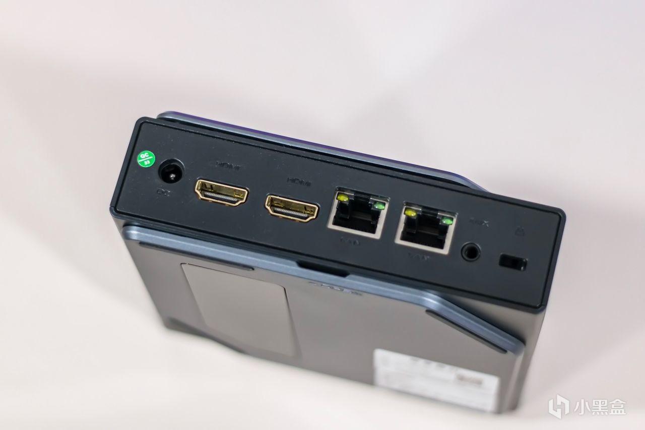 I/O接口主要集中在迷你主机的后部,从上往下分别是电源输入接口,两个HDMI视频输出接口,两个千兆以太网口,音频输出接口以及锁孔,可同时连接两台4K显示器,轻松实现双屏同步输出,双千兆网口适合作为软路由使用,或者开启链路聚合获得更高的传输速率。