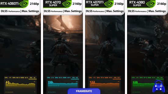 在4K全高设置下,RTX 4060Ti可以稳定60FPS,而RTX 4080S甚至可以达到130+FPS。