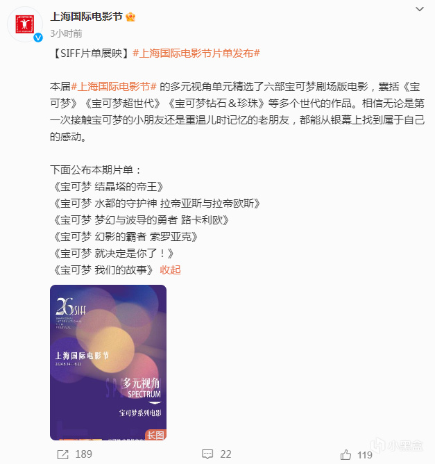 上海国际电影节官博宣布,6部宝可梦剧场版动画,将在今年6月的电影节期间,在上海部分影院上映。