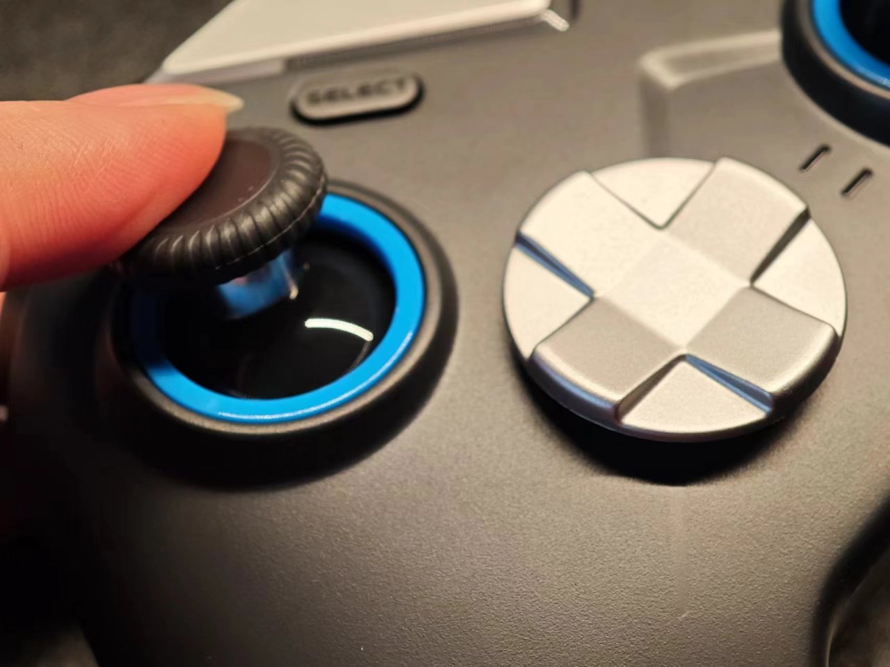 十字键采用的是圆盘八向十字键,内部是飞智自研转轴结构,每个方向都能精准按到,手感独特、质感不错。摇杆采用的是霍尔摇杆,相比传统碳膜摇杆,寿命更长,操控更精准,0死区、不漂移。摇杆下面是蓝色的pom环,摇杆中间还有一个钢圈,更加耐磨经用、转动丝滑且稳定可靠。