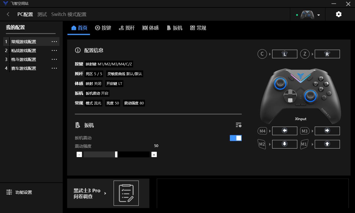 飞智的手柄驱动方面做的非常不错,可以设置的功能非常多。在飞智空间站中,可以更改6个自定义键,调节摇杆死区,体感映射,扳机震动,RGB灯效等。