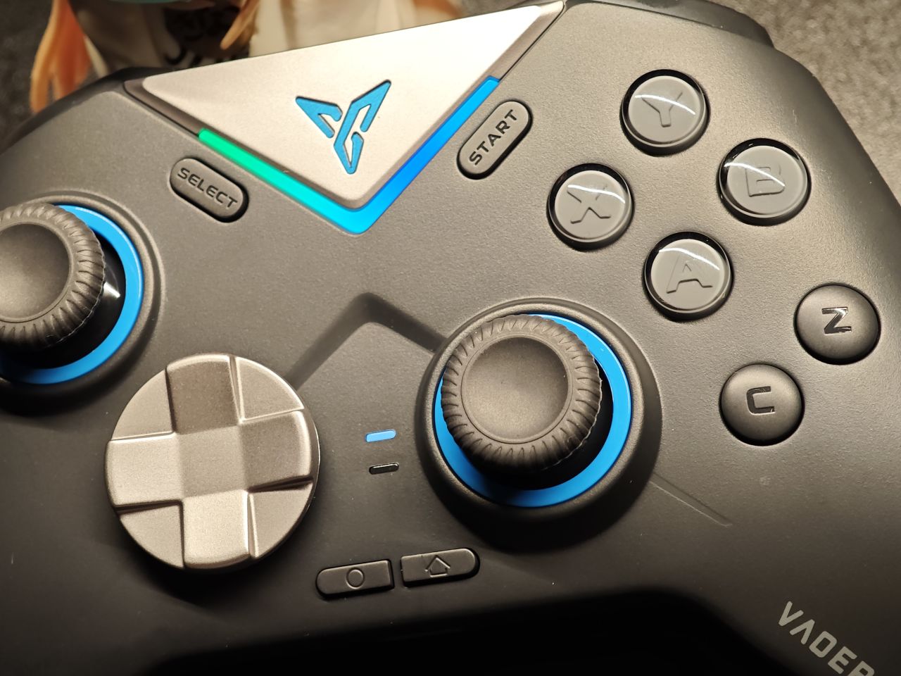 言归正传来说说我手上的这款黑武士3pro,ABXY按键采用的是机械按键2.0,按键声音清脆、手感舒服、反应快速、更加轻弹。布局采用的是XBOX布局,旁边还有两个C、Z自定义按键。中间是LED灯带,连接后发出RGB光效,灯效可以通过驱动修改。