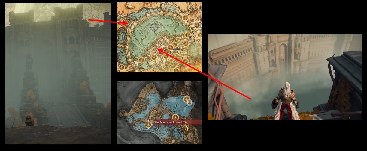 王城坑洞在地圖上對應的地下世界,恰好就是無名永恆之城。難道無名永恆之城曾經就在這兒,然後才被砸到地底的?又或者說無名永恆之城本就是王城羅德爾的一部分?細節已經無從考證,但我們至少可以從中知道一個線索:羅德爾王城與無名永恆之城之間的關係並不一般。