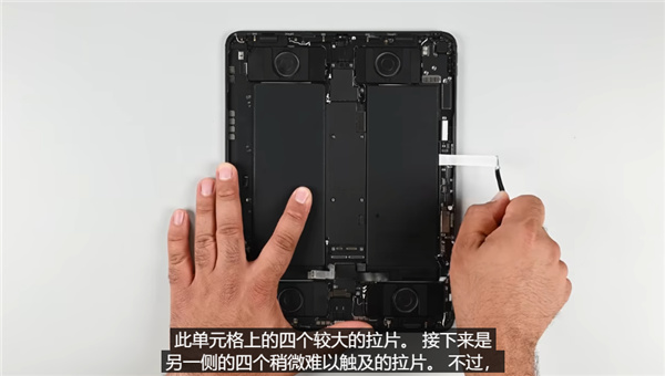 iFixit首先介绍了全新iPad Pro搭载的双层串联OLED技术,随后,iFixit表示,在全新iPad Pro中,我们首次能在取下屏幕后立即拆掉电池。
