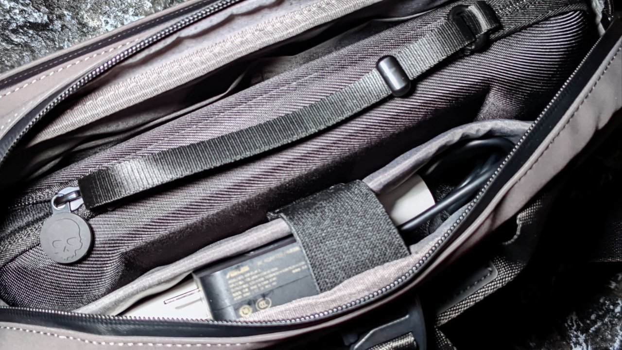 再来看容量,这包有一个独立的数码区,可以放iPad平版,11寸的平板勉强可以放下,我这里直接放充电包和ROG掌级的原装数据线了。
