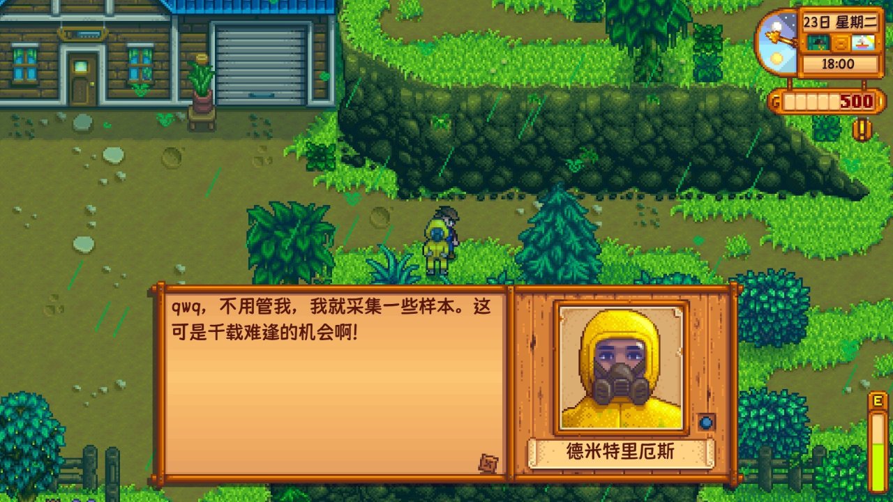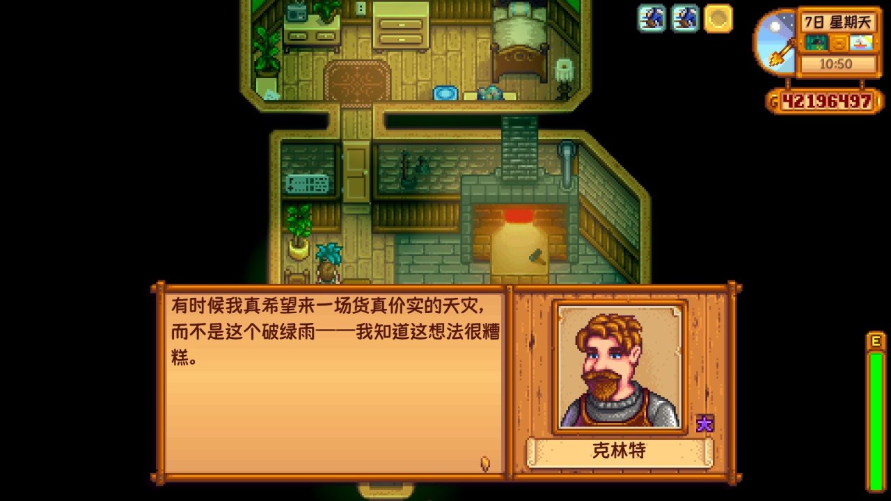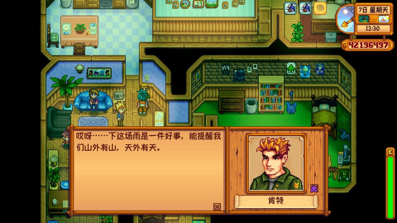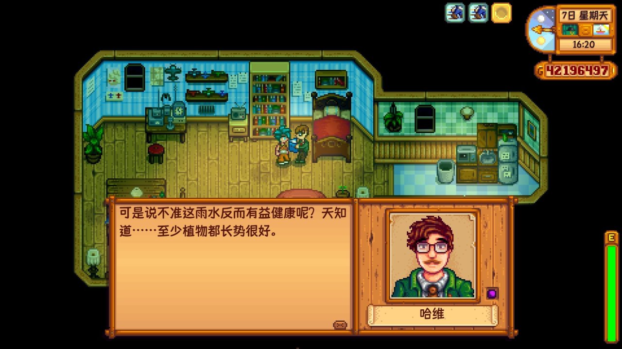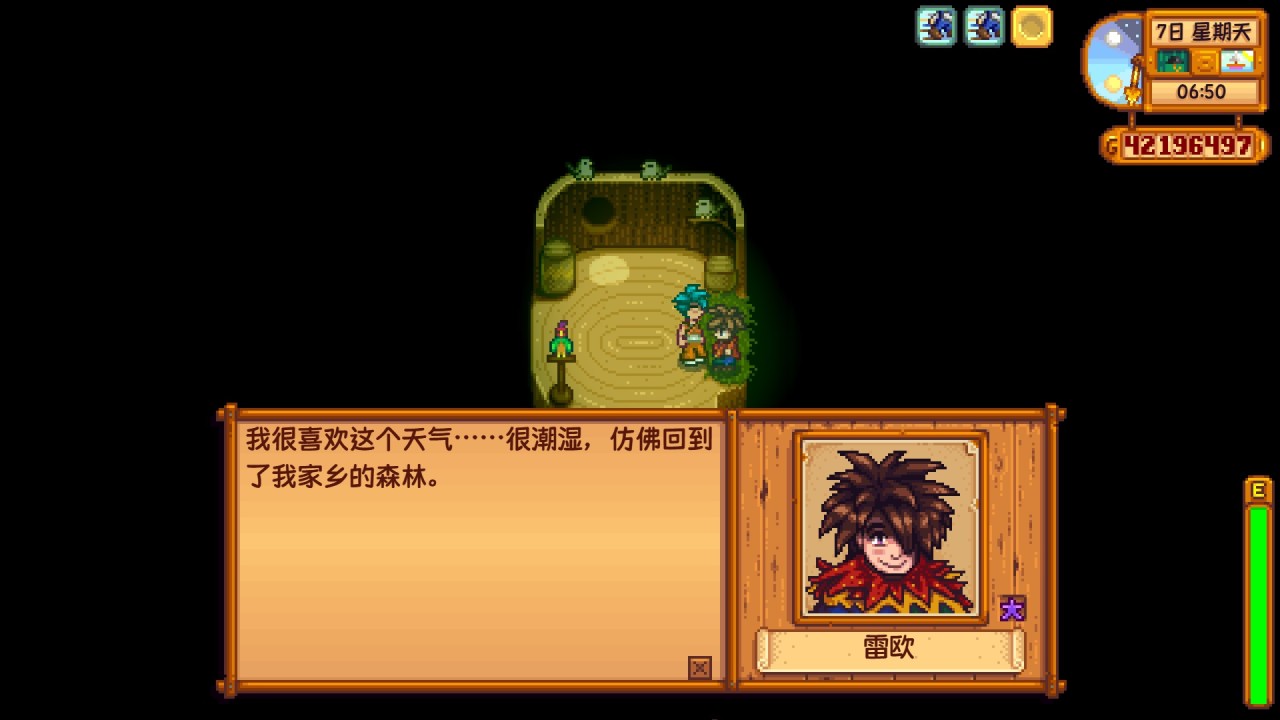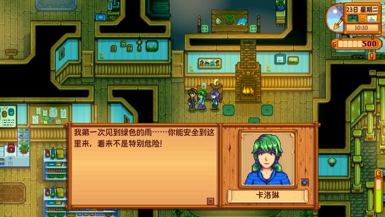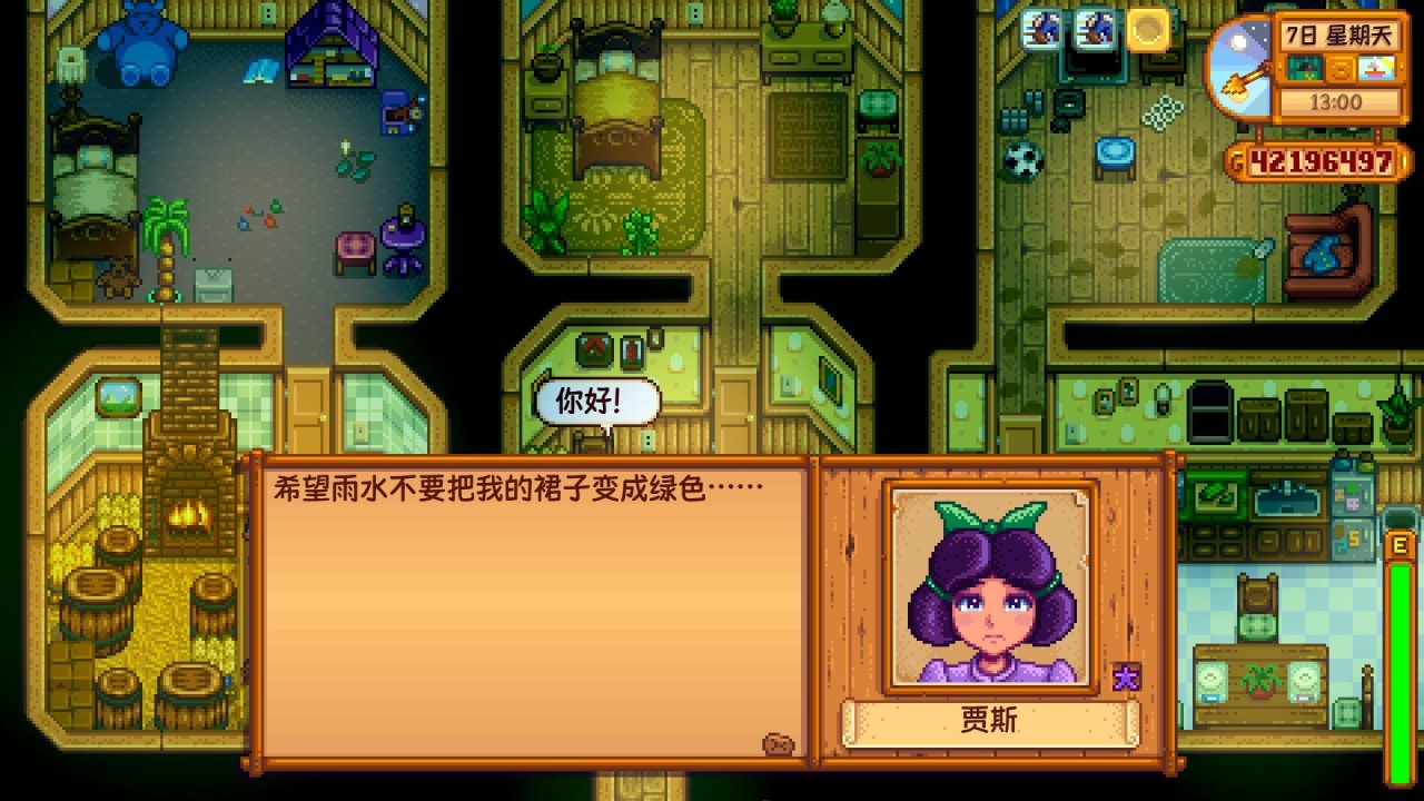 以上这几个第一年都很难解锁,有的甚至不可能,所以游戏作者应该把他们的对话固定了,下面再给大家看看第一年的绿雨结束后,第二天部分村民的反应!