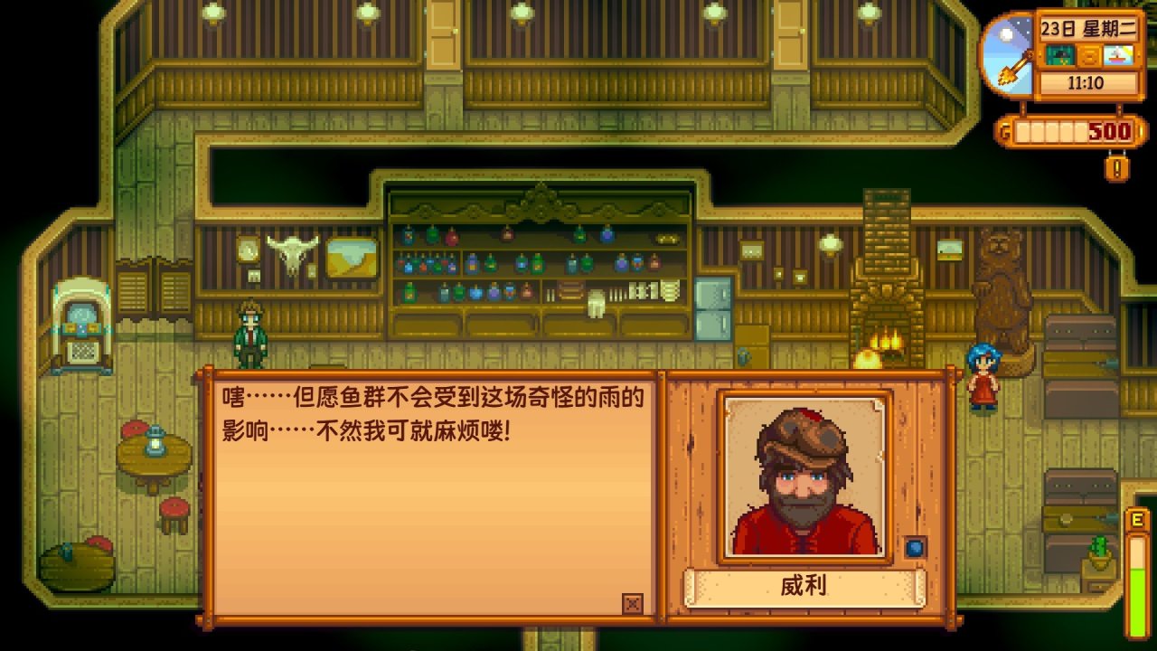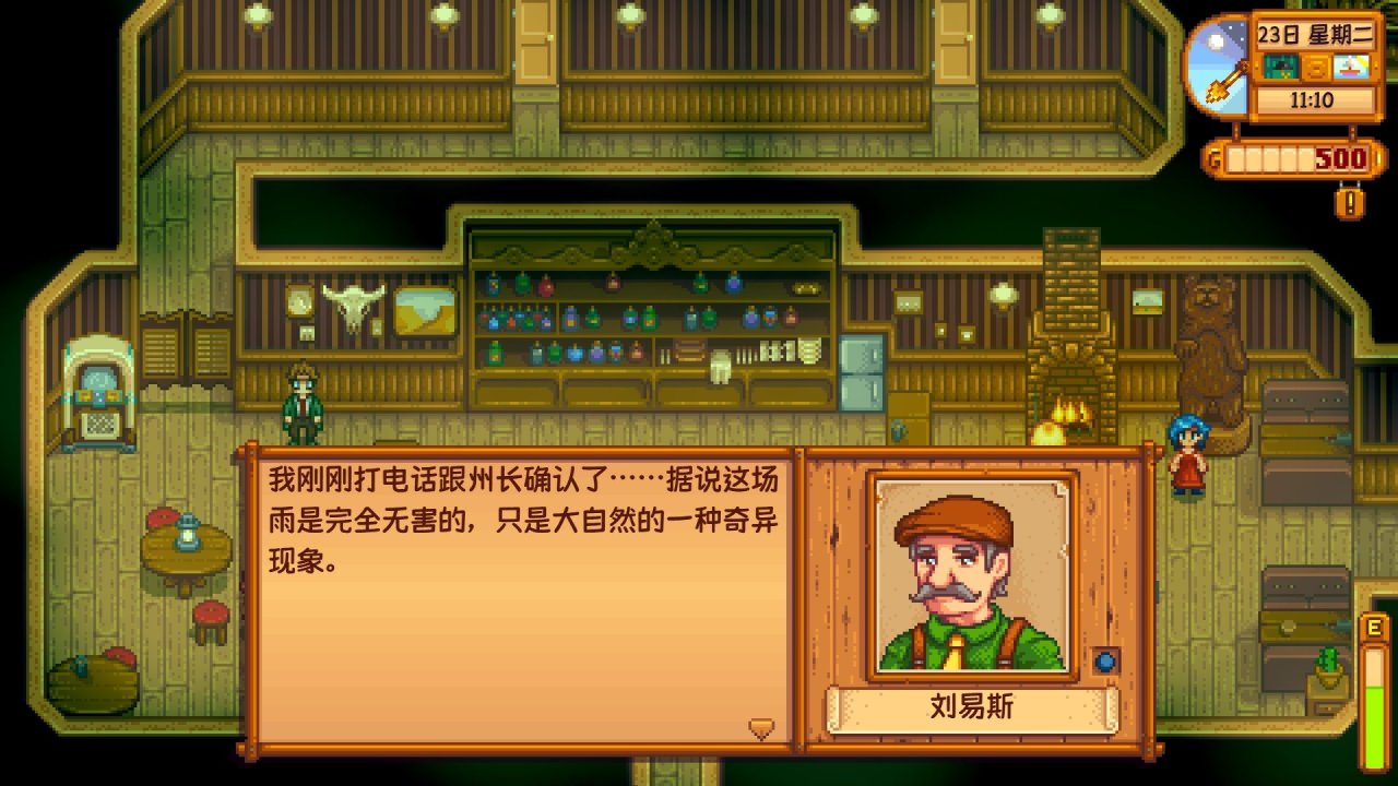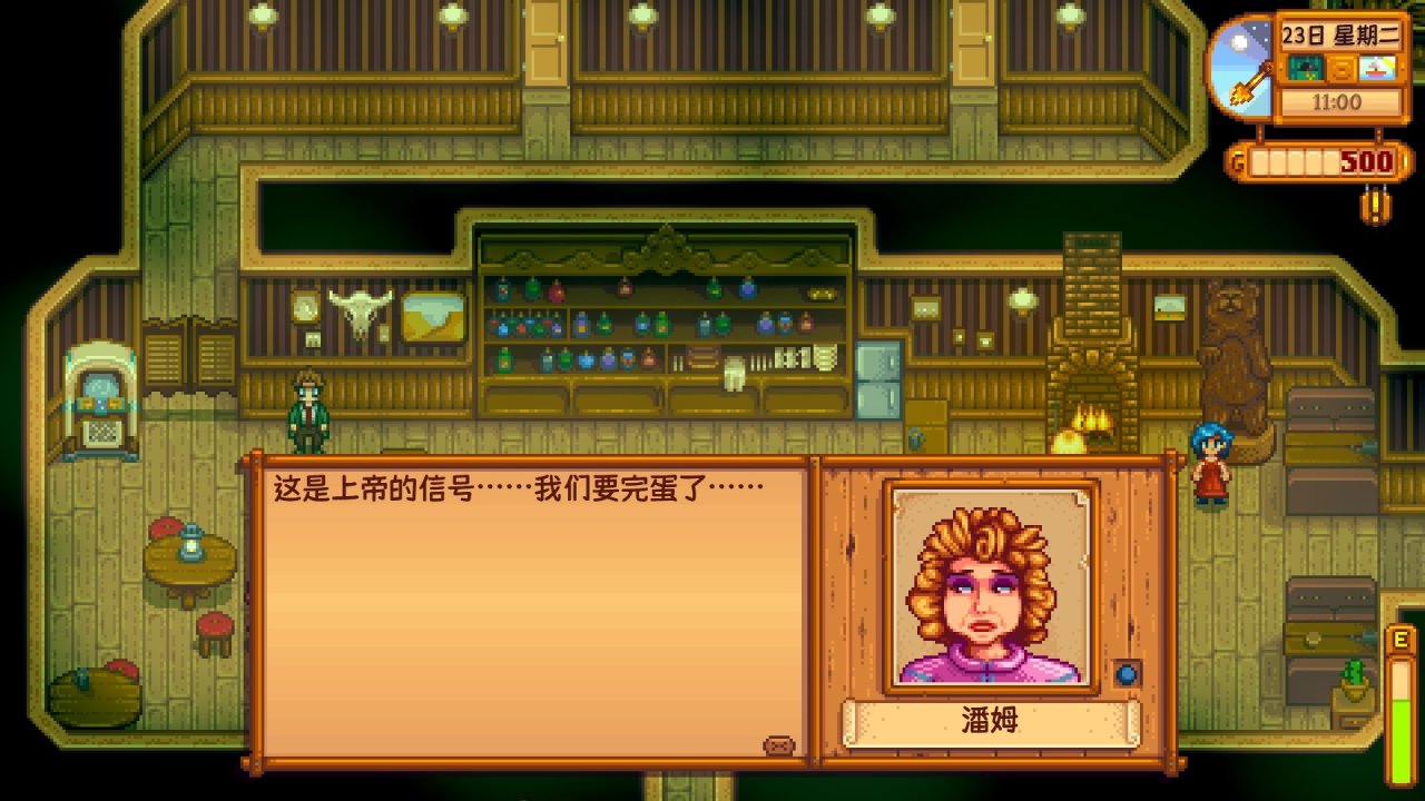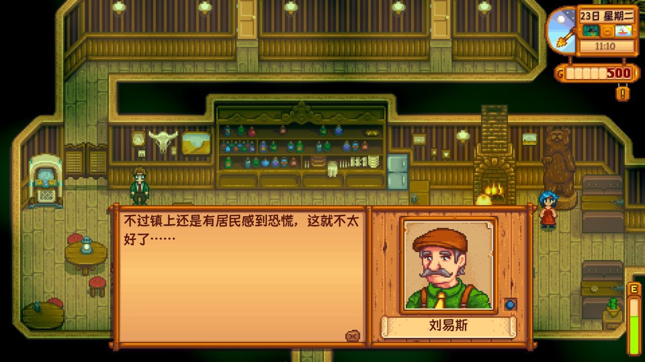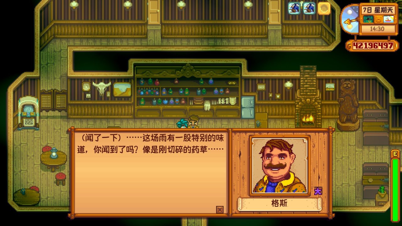 酒吧里有食物与饮品,大家一天都在这里避难,这场绿雨格斯赢麻了,收获了村民的感激(感激格斯提供避难场地)与金钱