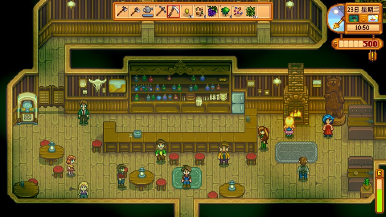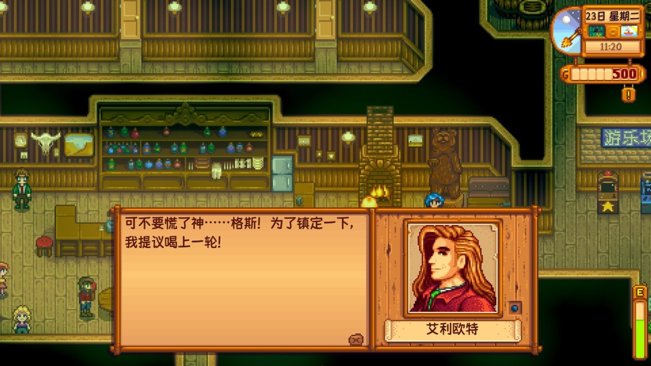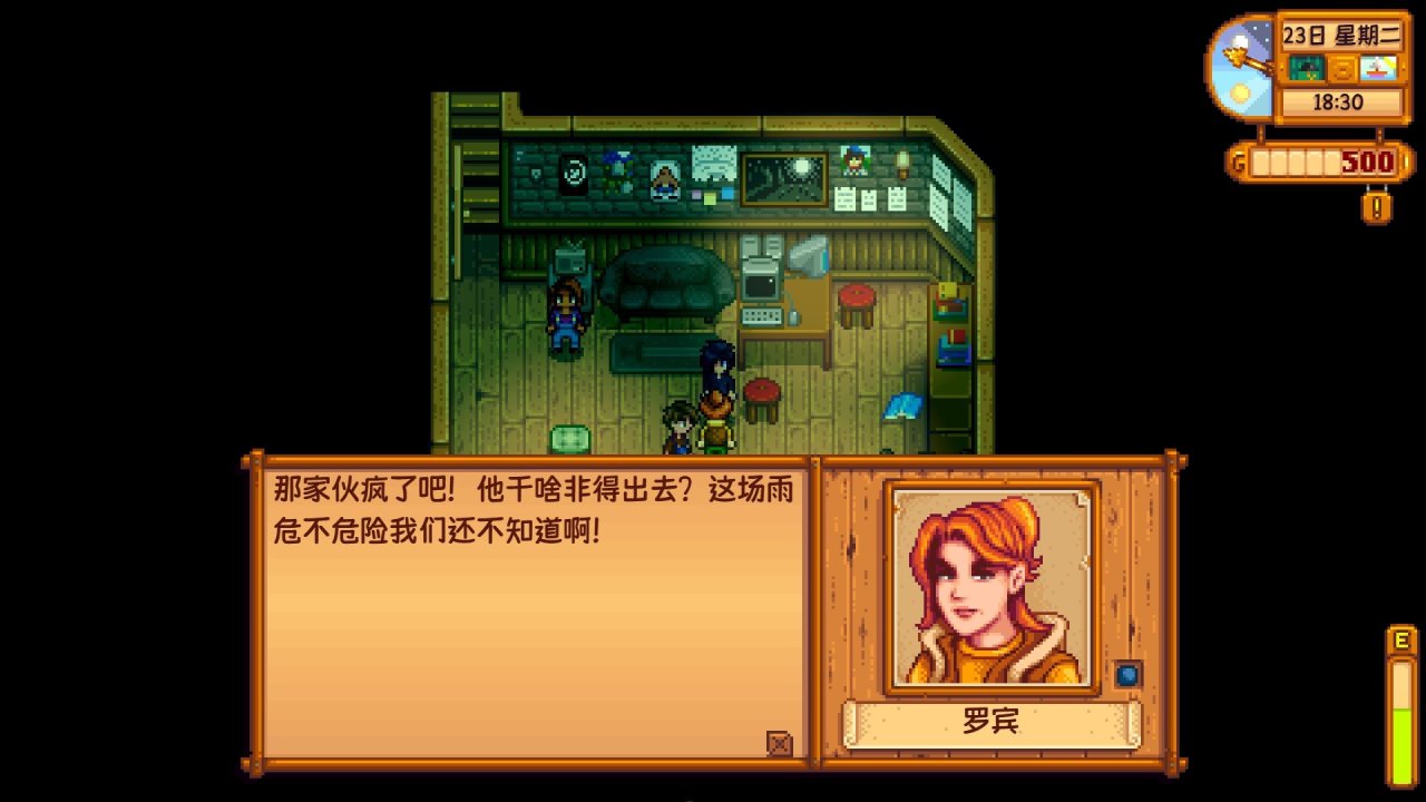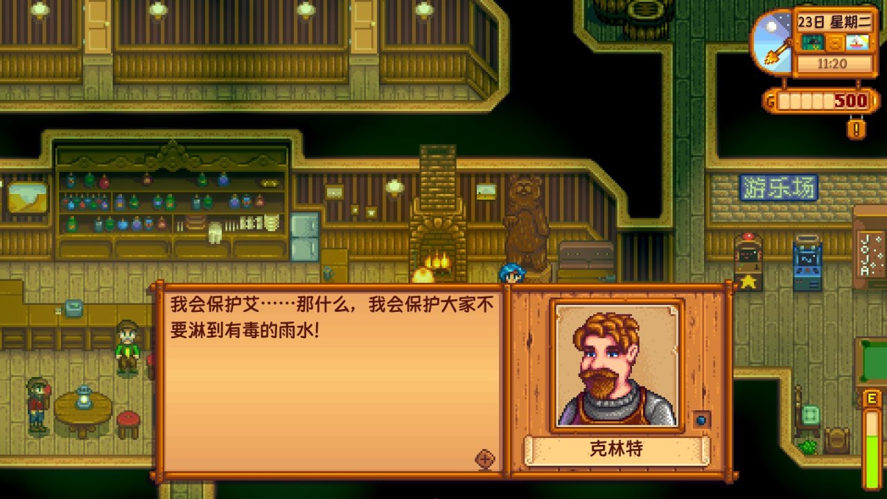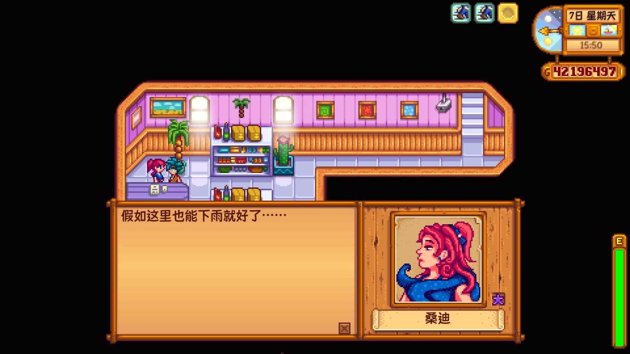酒吧里有食物与饮品,大家一天都在这里避难,这场绿雨格斯赢麻了,收获了村民的感激(感激格斯提供避难场地)与金钱