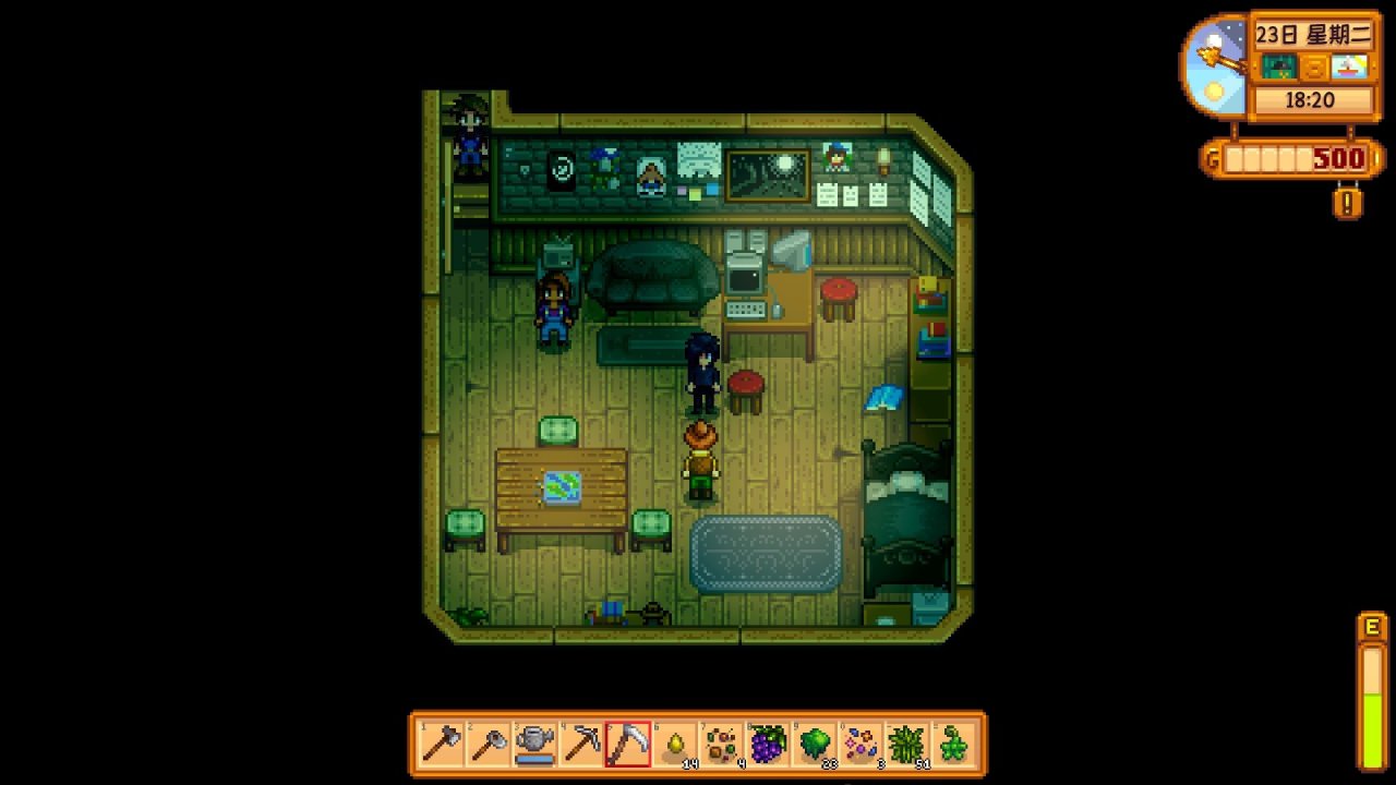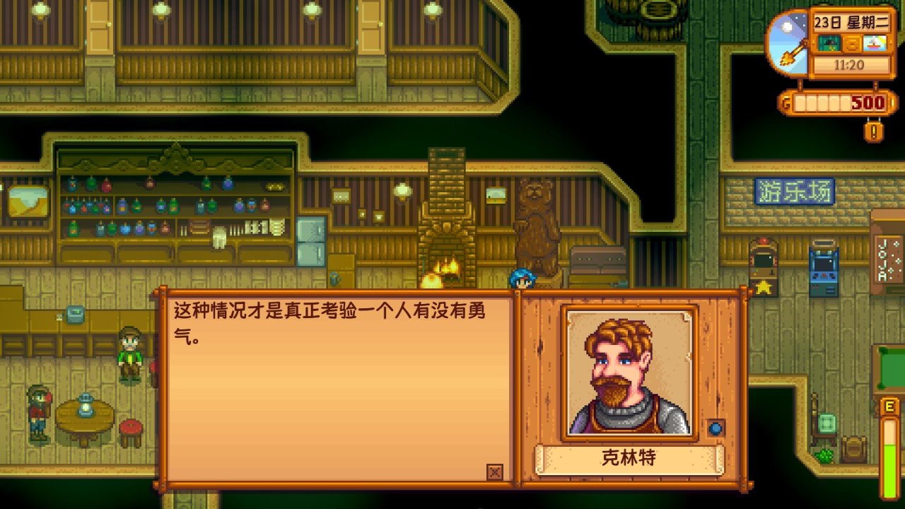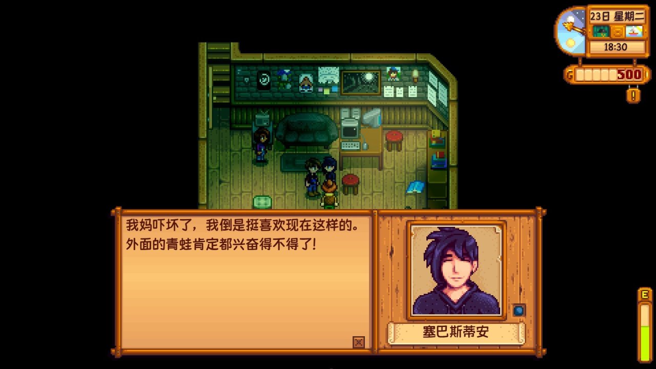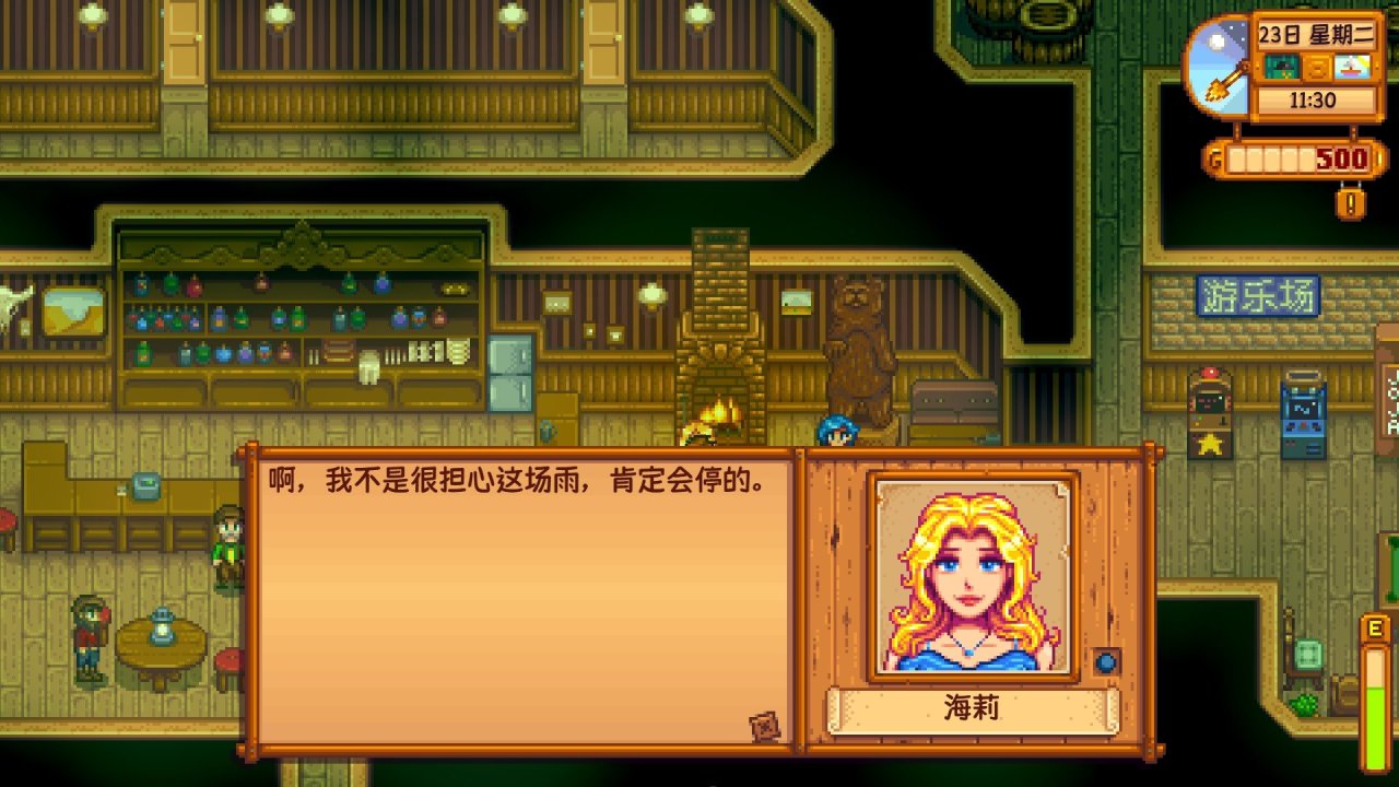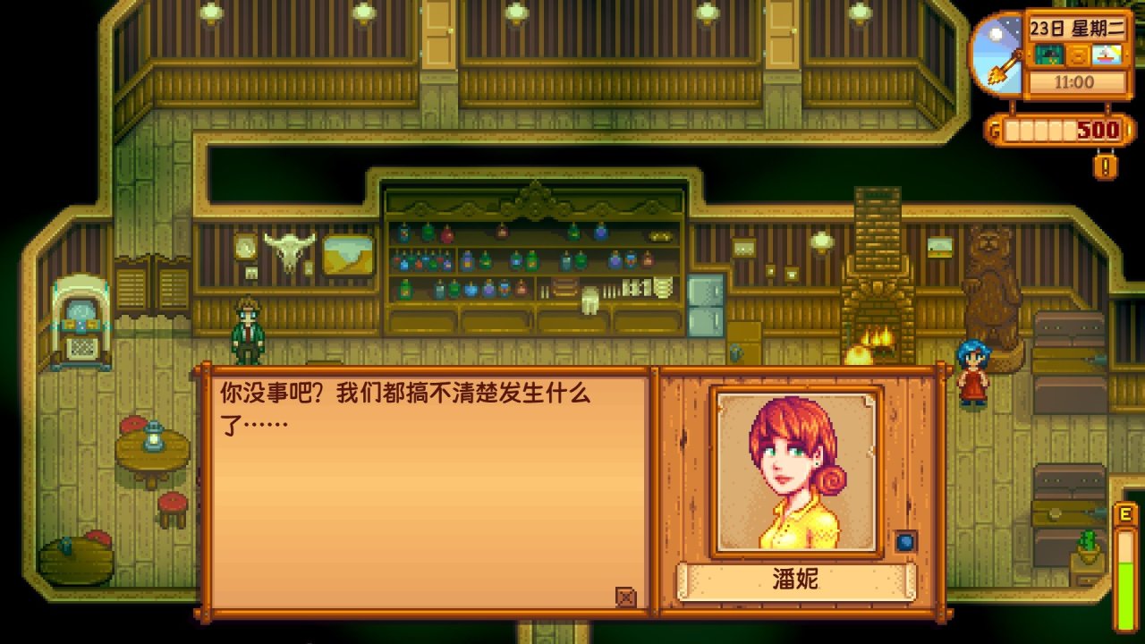 酒吧里有食物与饮品,大家一天都在这里避难,这场绿雨格斯赢麻了,收获了村民的感激(感激格斯提供避难场地)与金钱