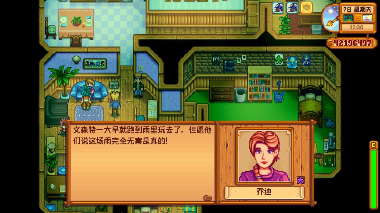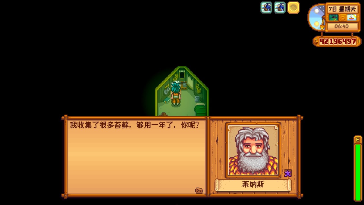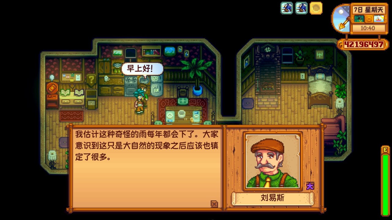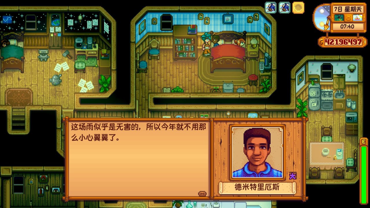 第二年的绿雨过后,村民们因为已经习惯了绿雨,是不会有像第一年绿雨过后时的特殊对话的,所以说游戏作者真的十分细节,特别是这个村民第一次见绿雨时的对话,第一次见完绿雨后的对话,以及第二年往后见到绿雨时的对话都有所不同,虽说是小小像素人,但是构造的确是十分真实,如同一个真实的世界