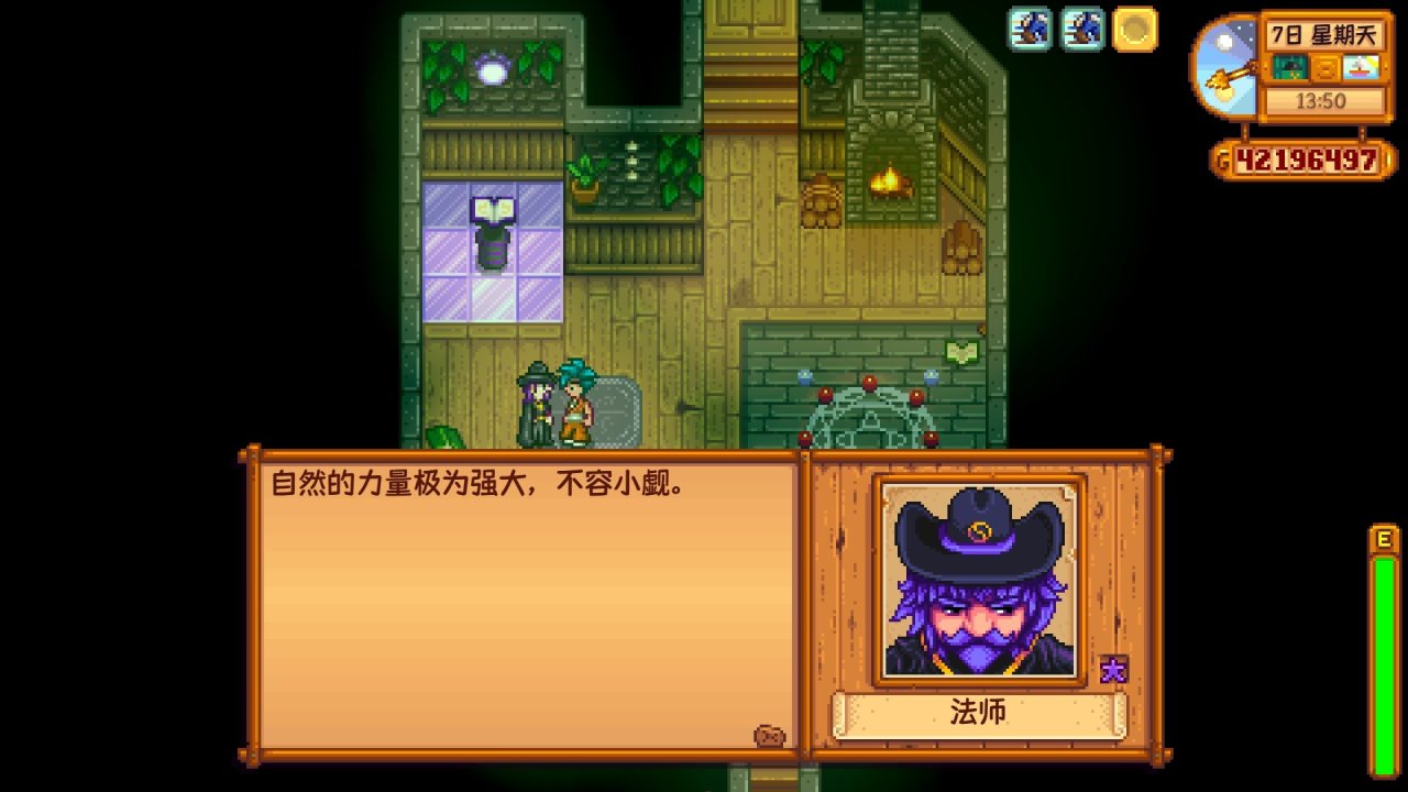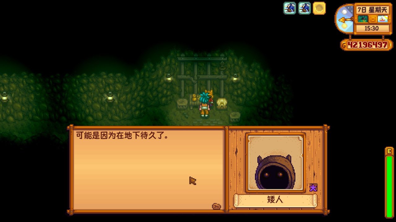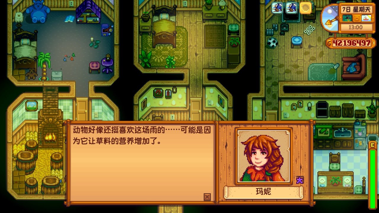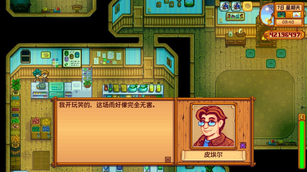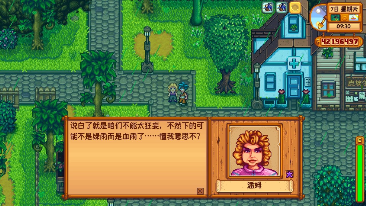 第二年的绿雨过后,村民们因为已经习惯了绿雨,是不会有像第一年绿雨过后时的特殊对话的,所以说游戏作者真的十分细节,特别是这个村民第一次见绿雨时的对话,第一次见完绿雨后的对话,以及第二年往后见到绿雨时的对话都有所不同,虽说是小小像素人,但是构造的确是十分真实,如同一个真实的世界