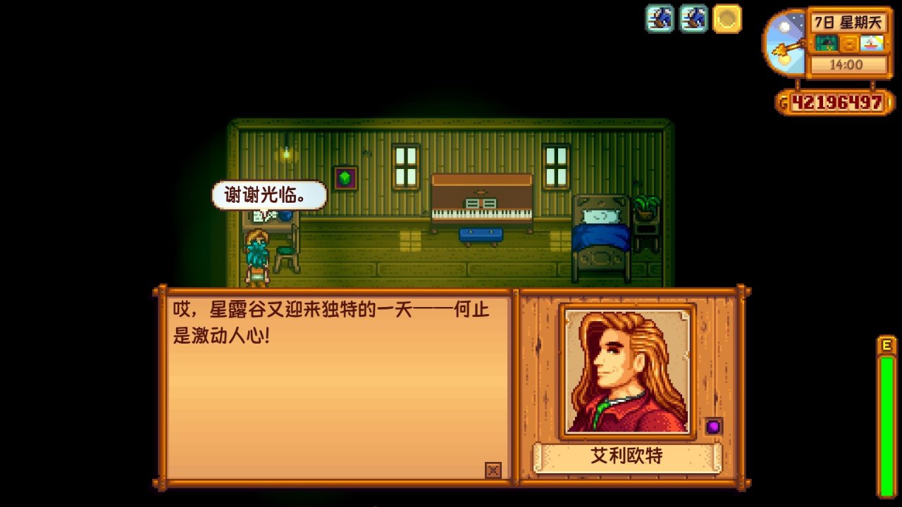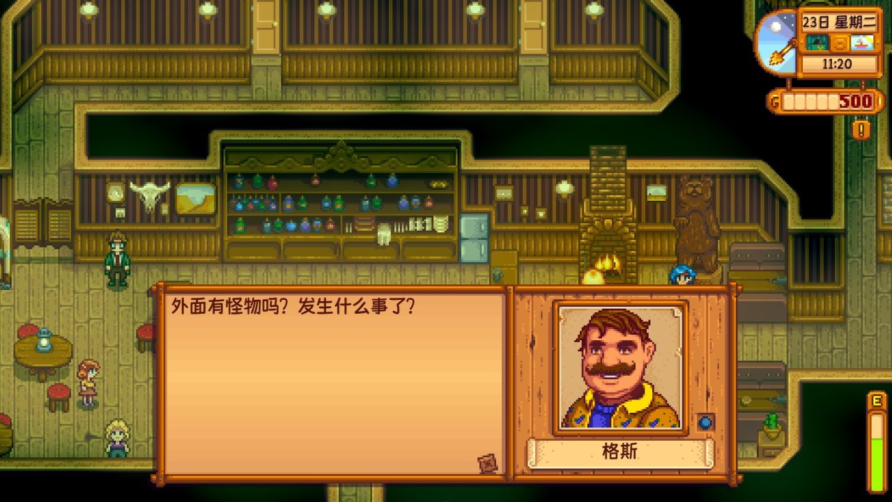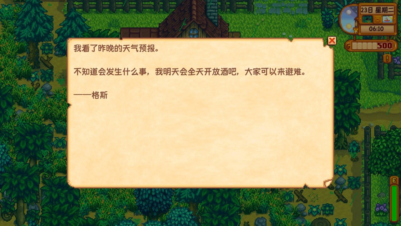 首先起床后,你会收到格斯寄给你的一封信,他会说今天全天开放酒吧,大家可以来避难,所以在这天很多人都会来到星之果实酒吧