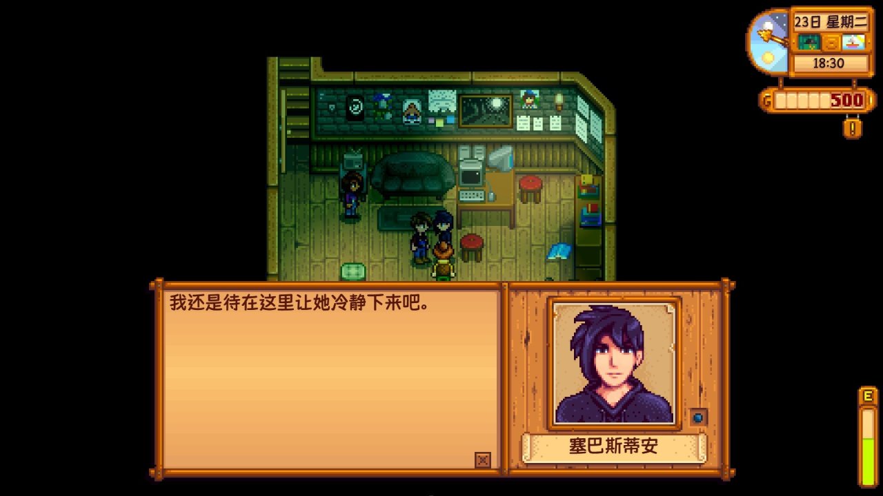 我们进到罗宾家,她们一家子几乎都挤在了塞巴斯蒂安的房间,在绿雨当天我们是可以直接进入塞巴斯蒂安房间的,不需要好感度,但绿雨过后就需要好感度才能进入了
