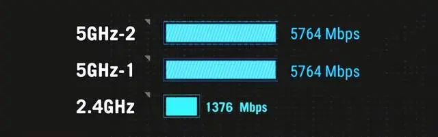 ▲华硕ROG GT-BE96拥有2.4GHz+双5GHz,共三个信道,其中5GHz最大带宽5764 Mbps,2.4GHz峰值带宽1376 Mbps。