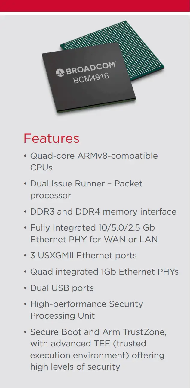 ▲说完了外观与接口,我们再来看一看这款路由器芯片配置,华硕RT-BE88U搭载了与ROG GT-BE96同款的博通(BROADCOM)全新旗舰CPU BCM4916,4核心2.6GHz,官方声称处理效率相较上代增强了30%。