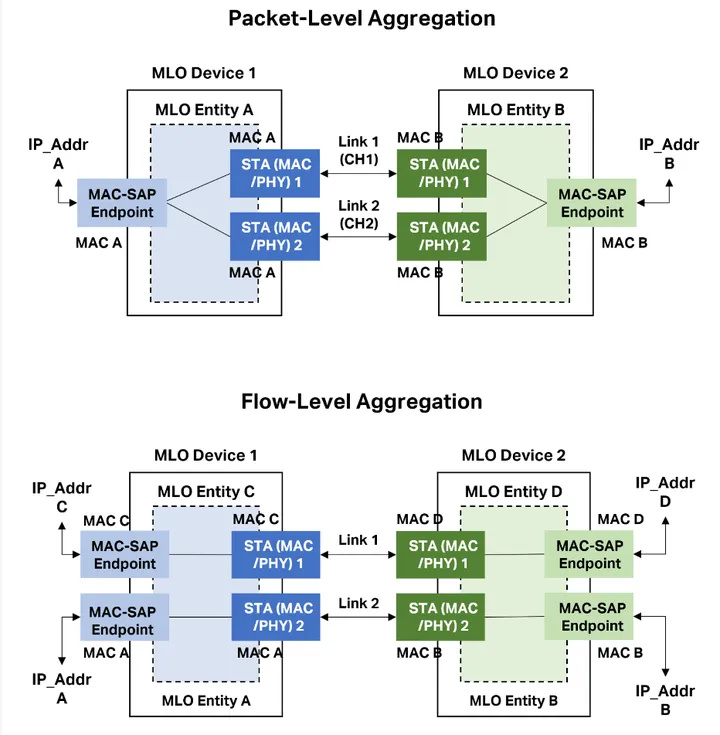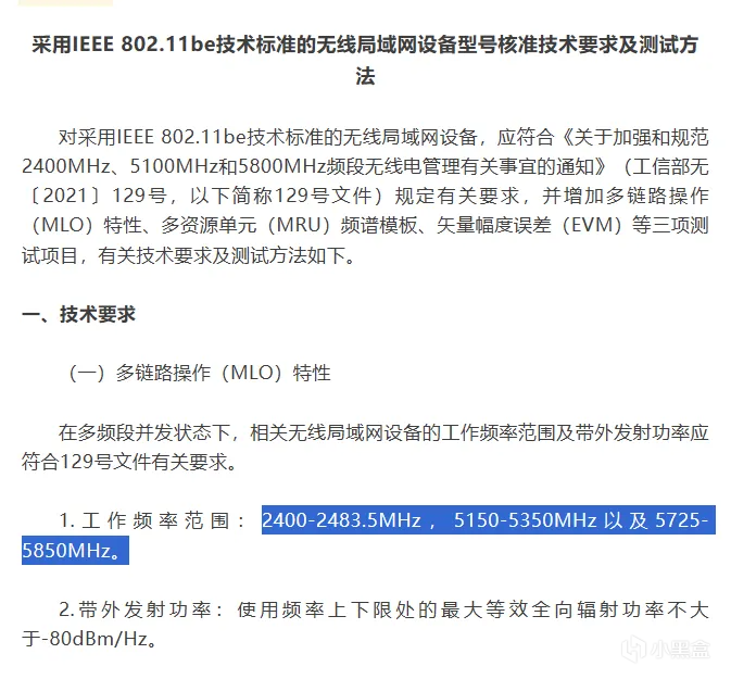 ▲另外,在国家无线电办公室印发的《采用IEEE 802.11be技术标准的无线局域网设备型号核准技术要求及测试方法的通知》中,已经添加了WiFi 7中5.2GHz与5.8GHz间的多链路操作(MLO)特性,因此,不同级别路由器即可选择2.4GHz与5.2GHz进行MLO,也可选择5.2GHz与5.8GHz进行MLO,进而提升实际连接的总带宽。